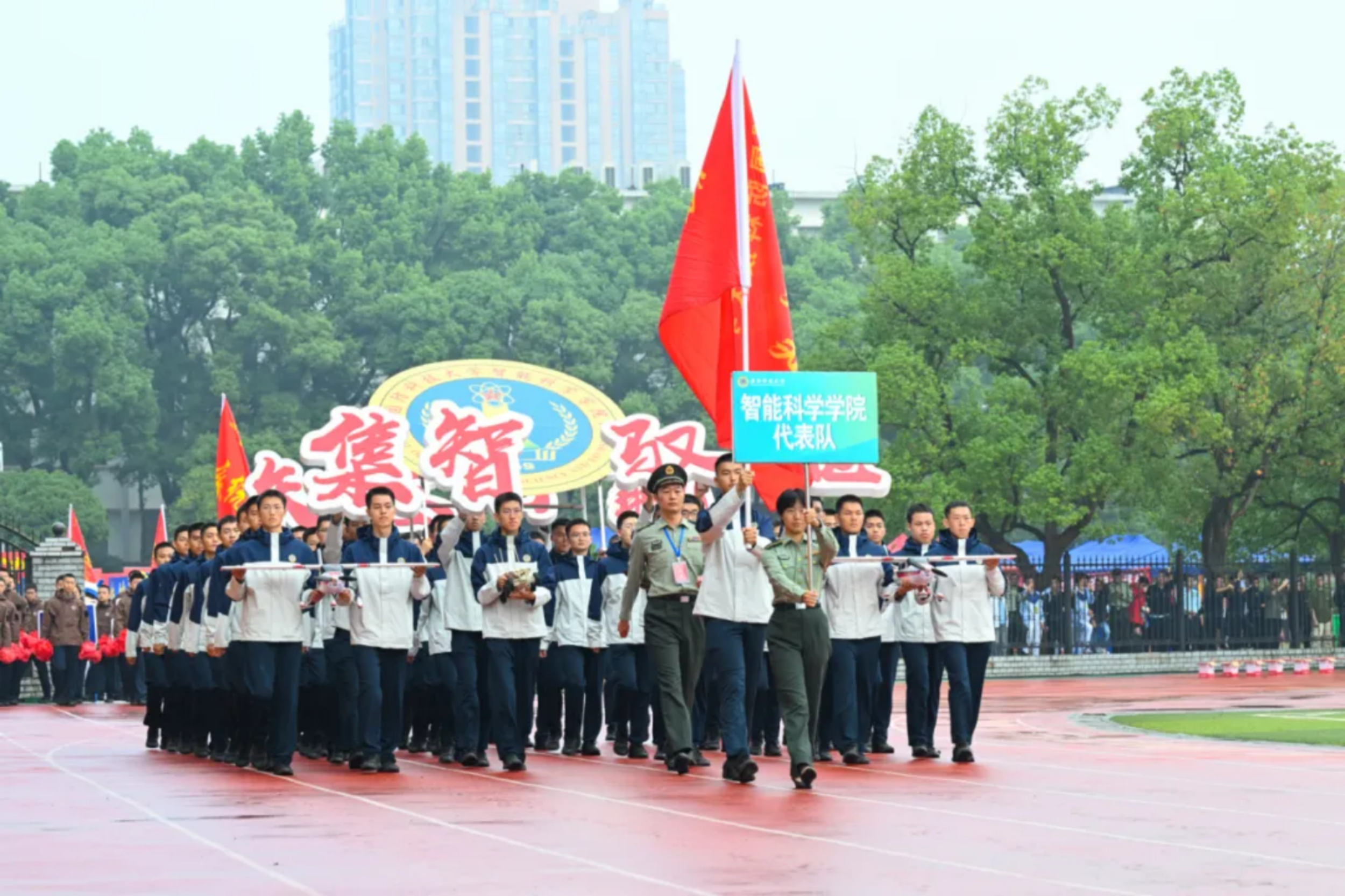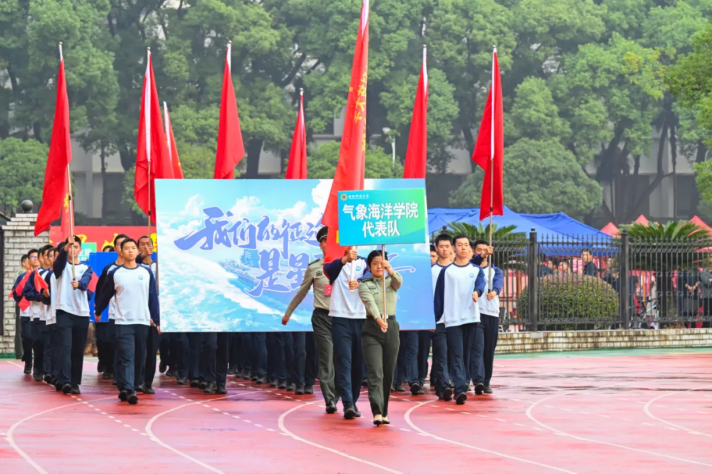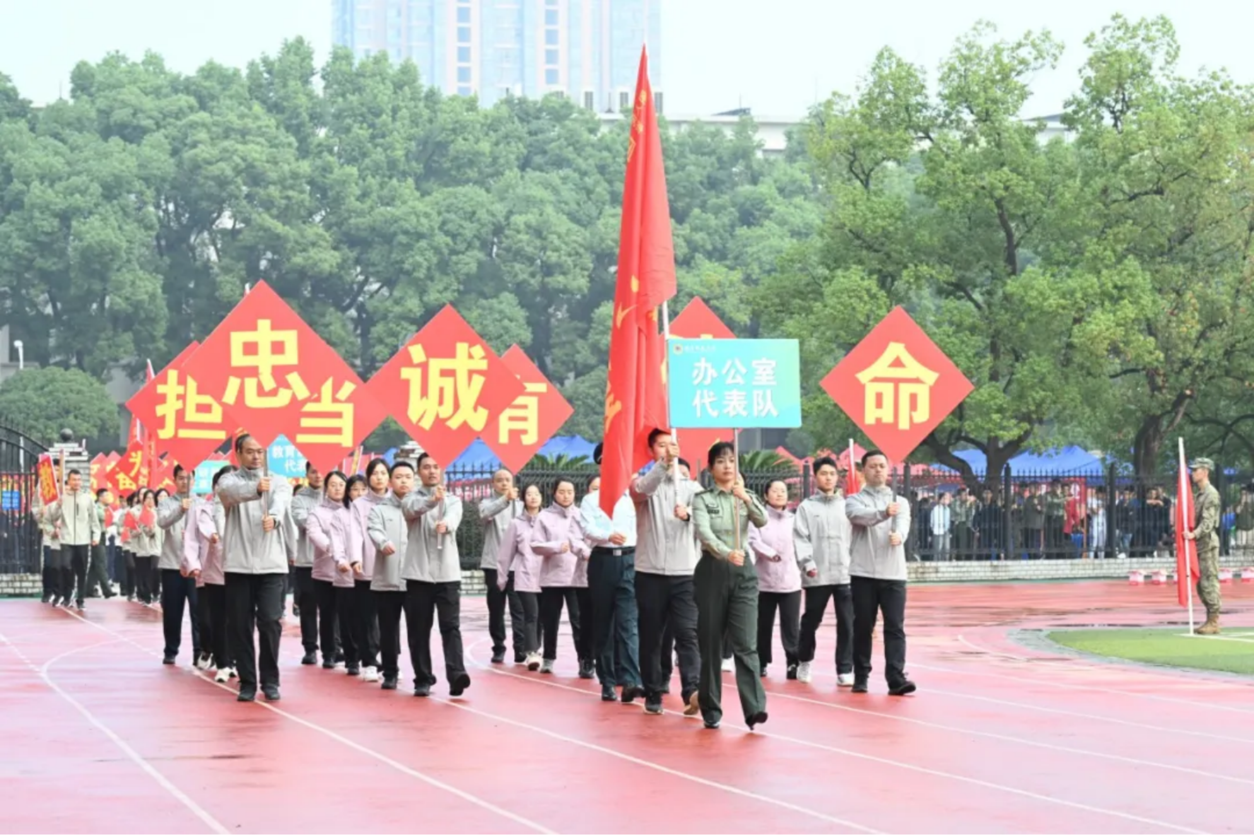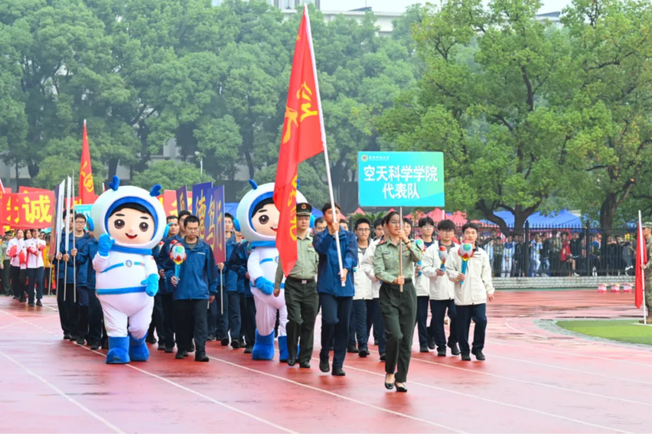 红旗猎猎,步伐铿锵。由军政基础教育学院学员某大队组成的红旗方阵走入会场。整齐的步伐迈在赛道上,也迈在奋进一流的征程上。