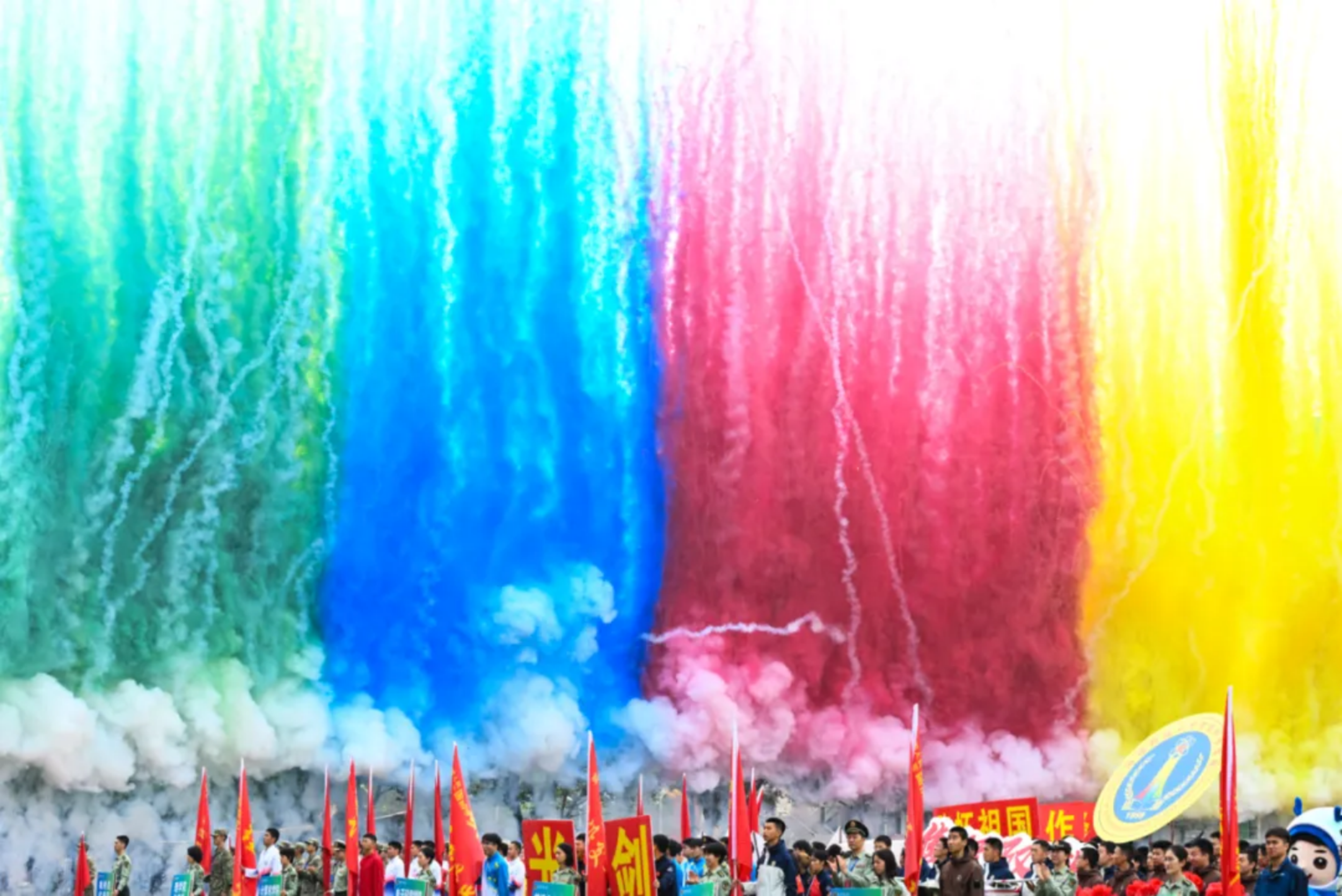大幕拉开,多色彩烟直冲云霄。“跨越艰难困苦,我们携手共闯,穿越时间河流,哈军工激荡胸膛。”伴随着大学原创歌曲《跨·越》,本次运动会正式拉开帷幕。