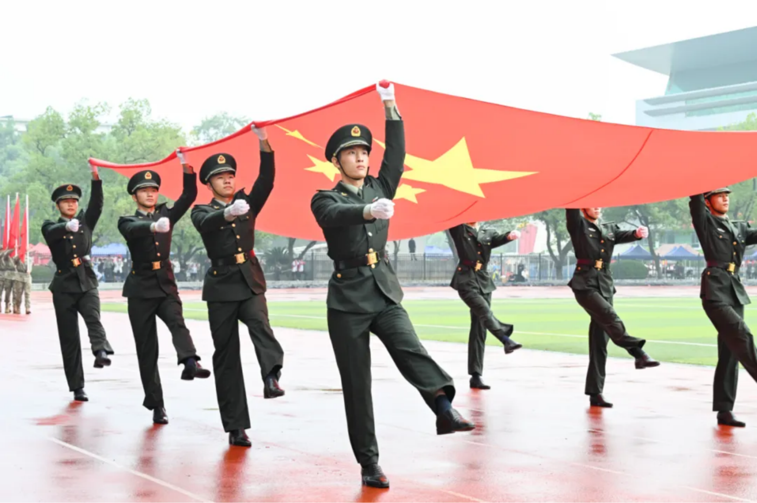 仪仗队护送着鲜艳的五星红旗,正迈步走向主席台。国旗招展,激扬的是铁心向党、矢志强军的坚定信仰信念。