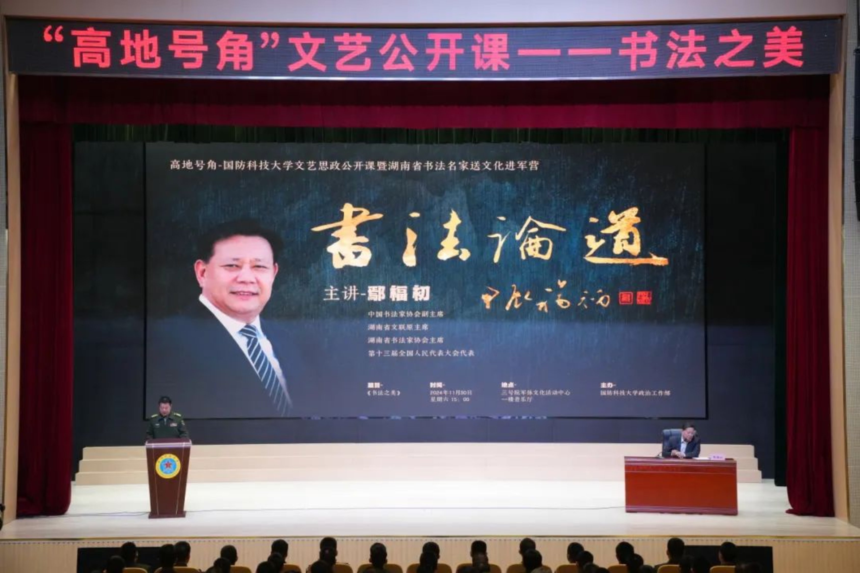 近日,国防科大第2期“高地号角”文艺公开课在长沙校区三号院音乐厅成功举行。中国书法家协会副主席鄢福初以“书法之美”为主题,为全校师生带来一场书法与情怀的精神之旅。学校政委陈国强出席活动并为鄢福初颁发“高地”文化大使荣誉证书。