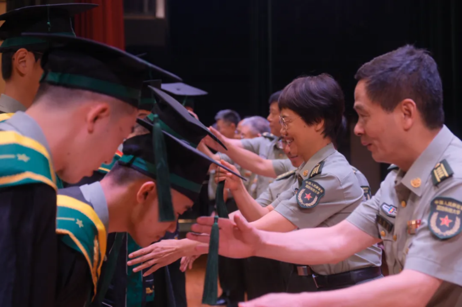 典礼上,学院领导宣读了本科学员的毕业决定及学位授予决定,毕业学子身披带有“厚德博学·强军兴国”刺绣的学士服,踏着《高地荣光》的豪迈旋律,步伐铿锵迈上主席台,接受拨穗。台上,一张张脸庞洋溢着收获的喜悦;台下,掌声一浪高过一浪,为学子学成期满送上祝福。从学士服到戎装,学员们褪去书生气,即将奔赴练兵备战一线,投身火热强军事业。