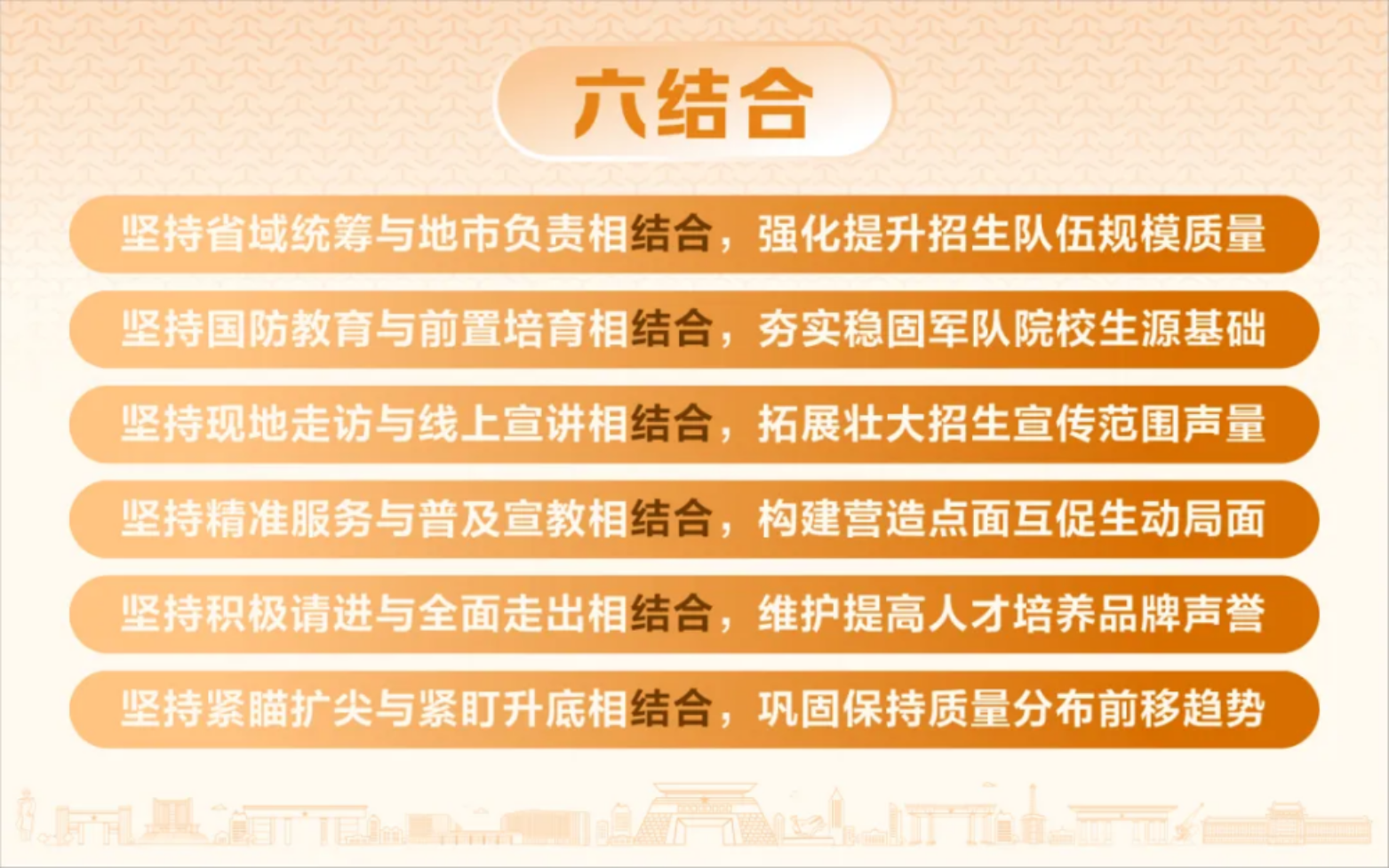 2025年,学校招办将持续按照“六全六抓六结合”总体策略,体系设计整体推进本科招生工作;持续推进持正温暖的招生文化建设,不断吸引汇聚有志青年投身强军实践、奋进一流事业。