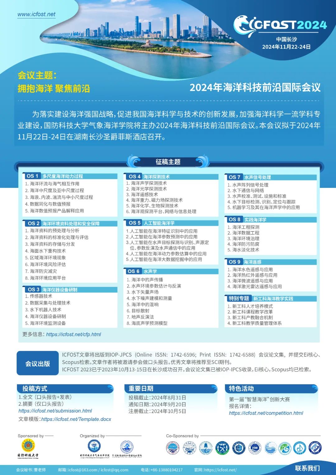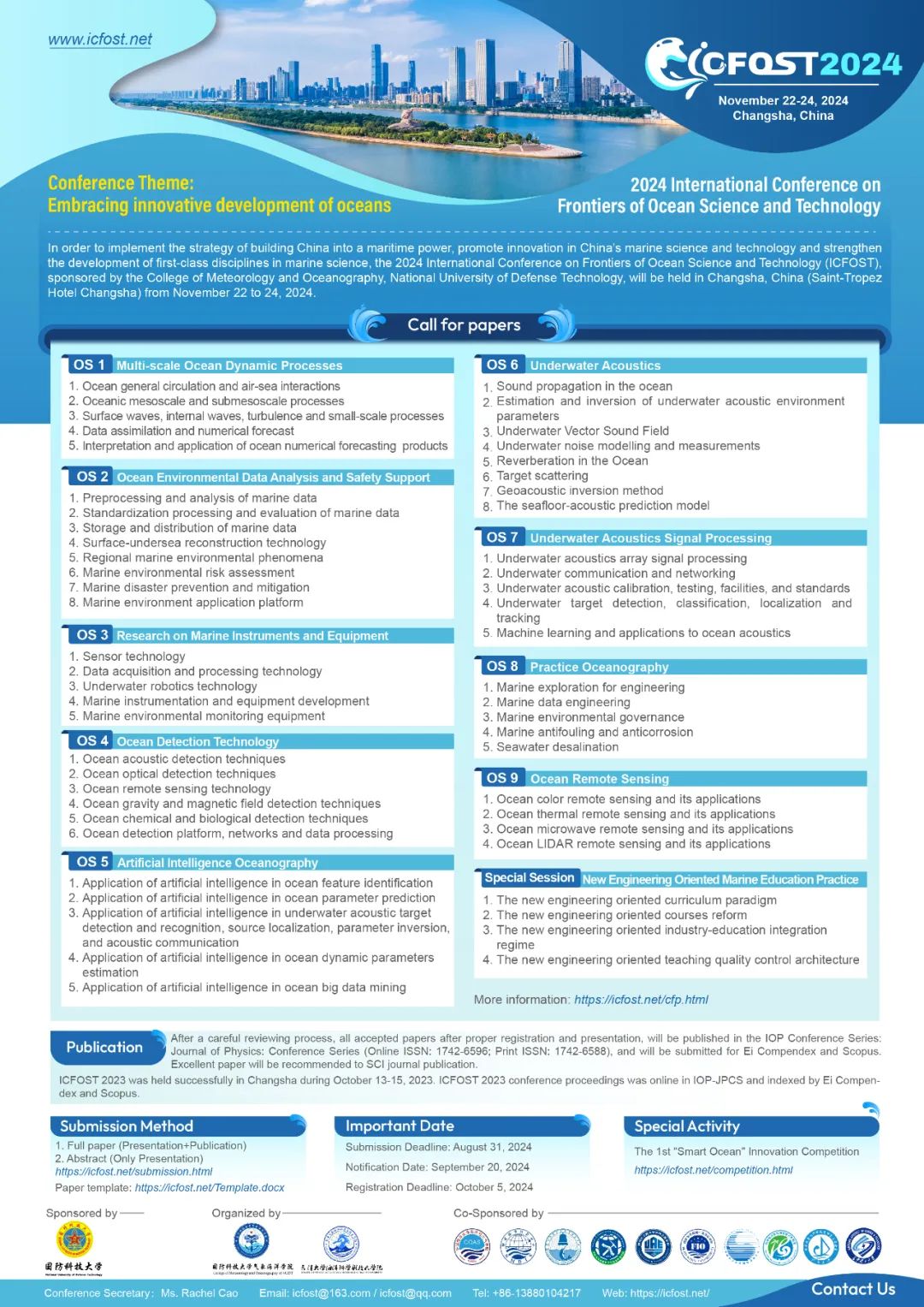 为了深化学术交流并推动海洋科学与技术领域的创新,2024年海洋科技前沿国际会议的组委会荣幸地邀请了来自海洋科学、海洋技术、海洋工程、海洋资源开发与应用、以及海洋装备研发与制造等多个领域的顶尖专家。本次会议将重点聚焦于以下九个专题:多尺度海洋动力过程、海洋环境资料处理和安全保障、海洋仪器设备研究、海洋探测技术、人工智能海洋学、水声学、水声信号处理、实践海洋学,海洋遥感以及特别专题新工科海洋教学实践。此外,会议还将特别增设第一届‘智慧海洋’创新大赛环节,旨在激发产学研各界的创新活力,共同促进海洋科学与技术的全面发展。