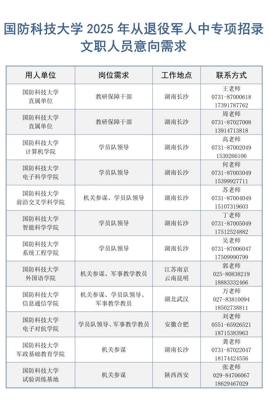 学校多渠道发布2025年从退役军人中专项招录文职人员的初步意向需求(正式岗位计划预计2024年12月发布)。结合年度退役工作安排,全面开展意向人选摸底筛选。