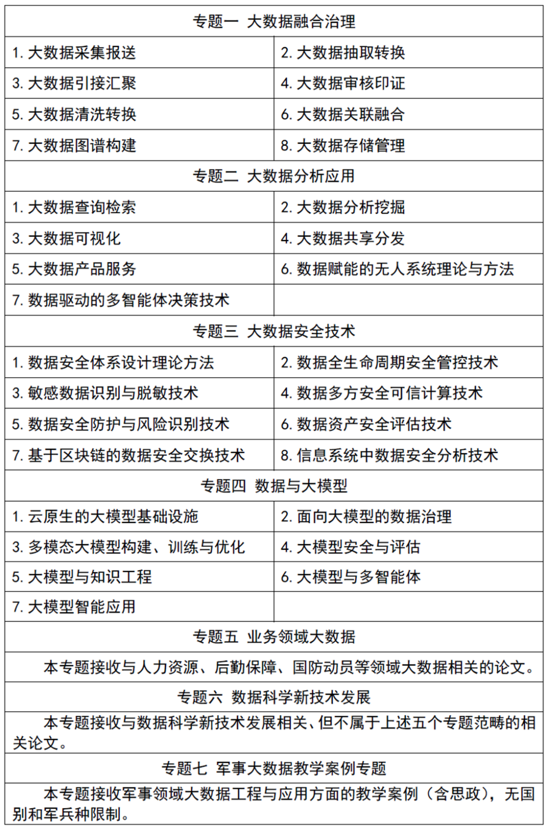本届论坛论文主题包括:大数据融合治理、大数据分析应用、大数据安全技术、数据与大模型、业务领域大数据、数据科学新技术发展、军事大数据教学案例专题。