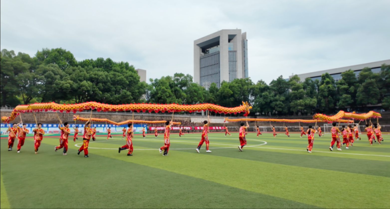 赛后,球场上迎来别样精彩。四条金龙翻腾,伴随着铿锵的鼓点,时而腾空跃起,时而盘旋游走。整场舞龙表演气势磅礴、精彩绝伦,引得现场观众阵阵喝彩,为赛事画上了圆满句号。