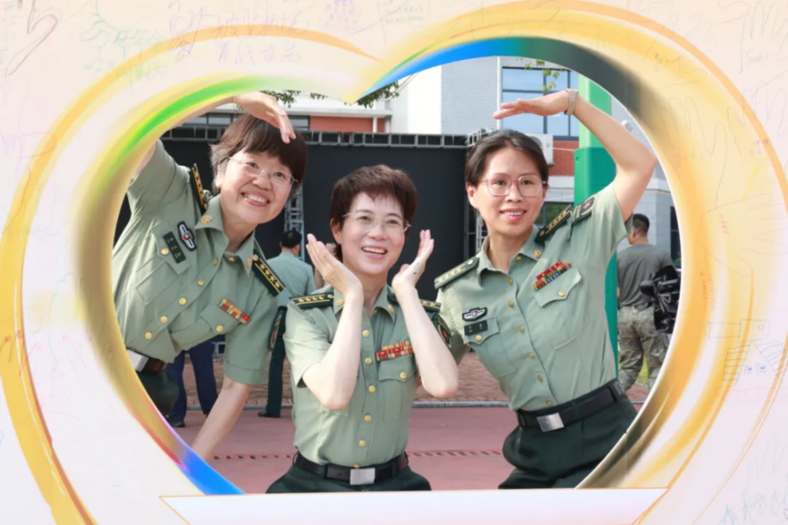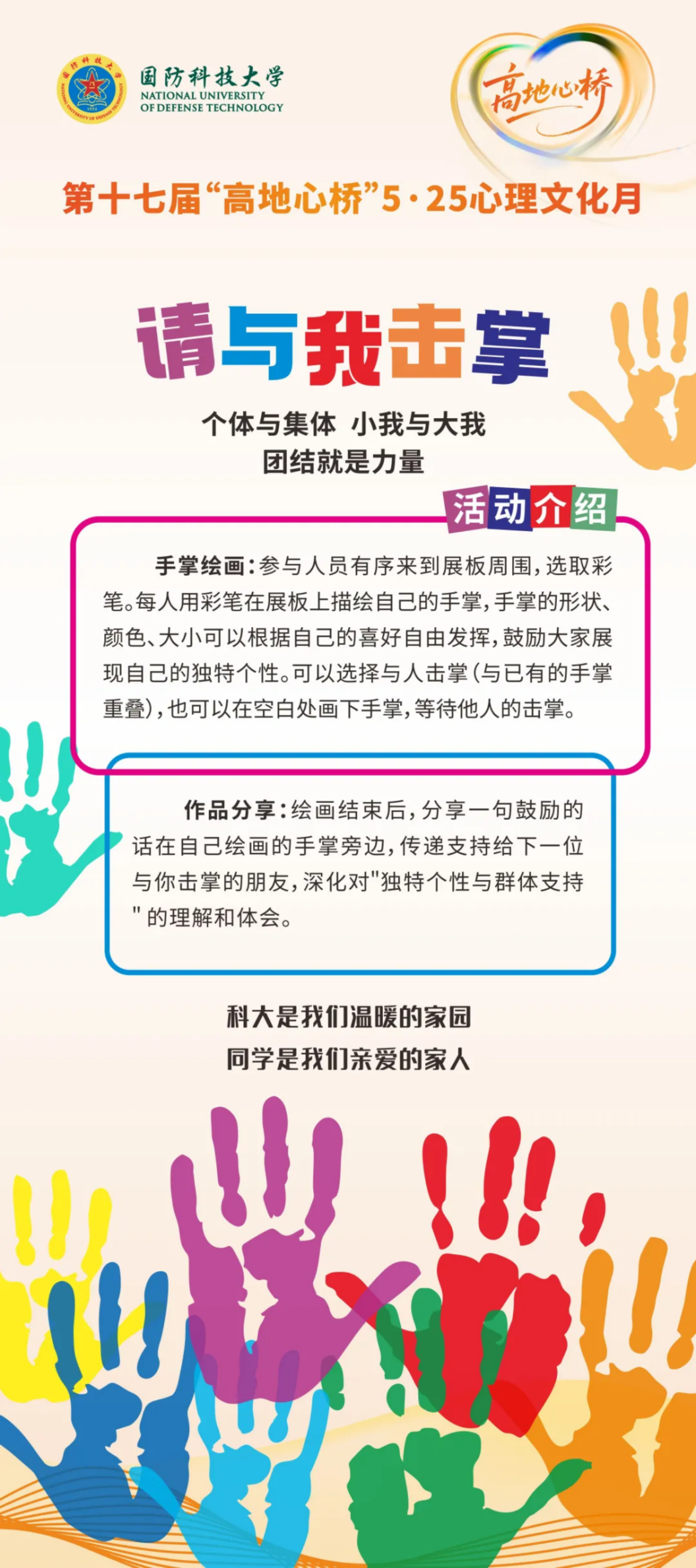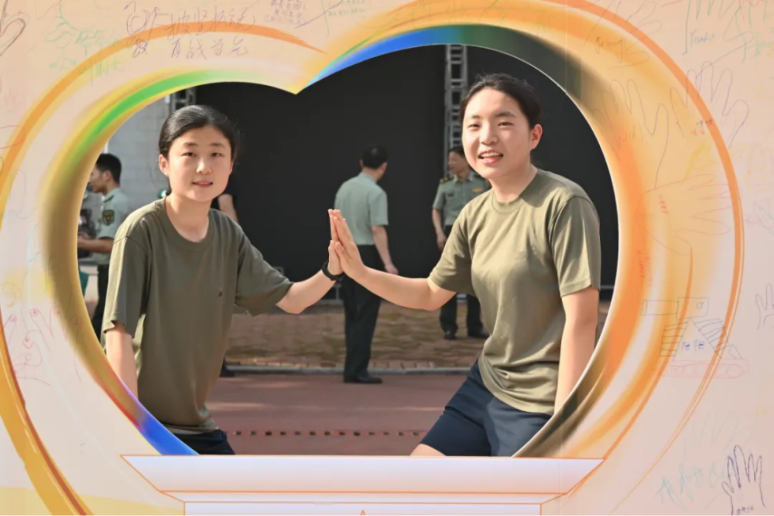 “请与我击掌”,手掌轮廓画满祝福与心声,无声的击掌传递战友间最温暖的力量,五湖四海的梦想在此共鸣。