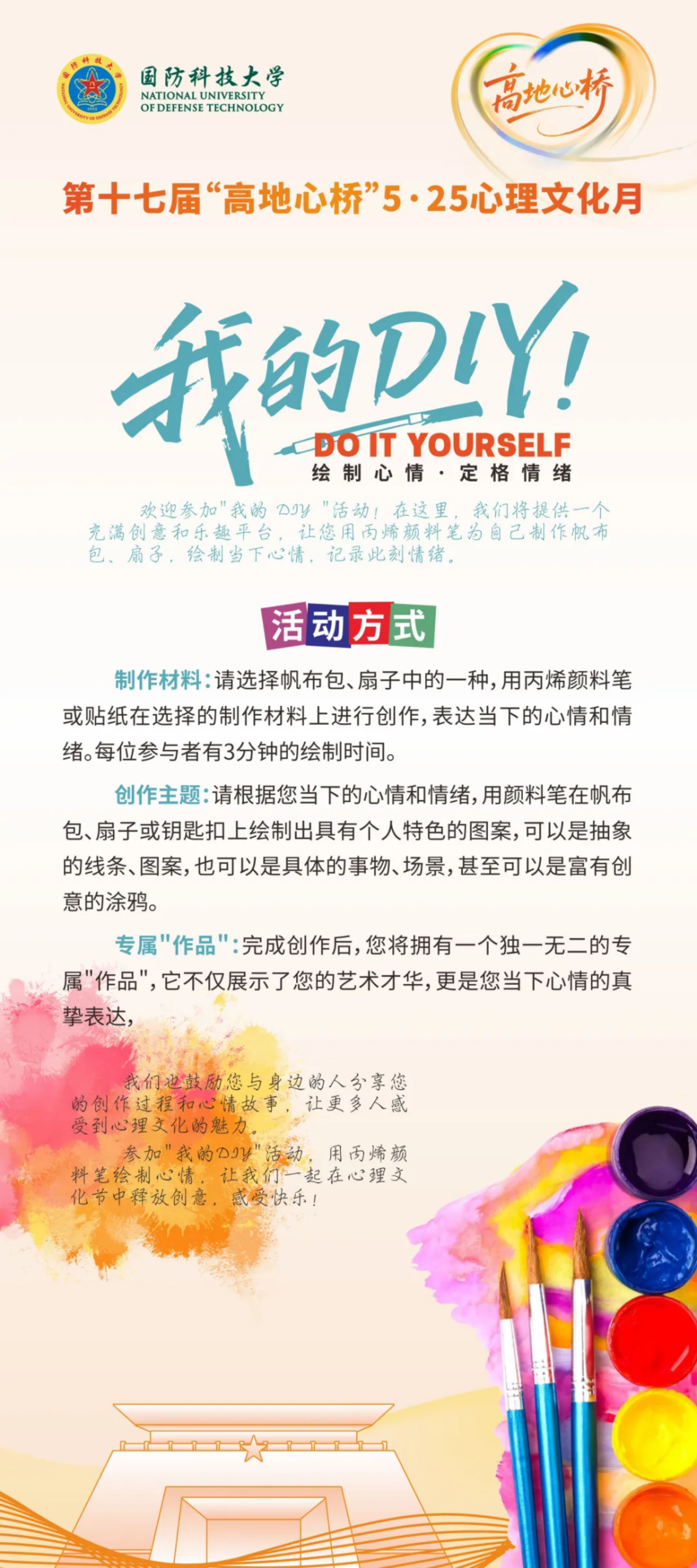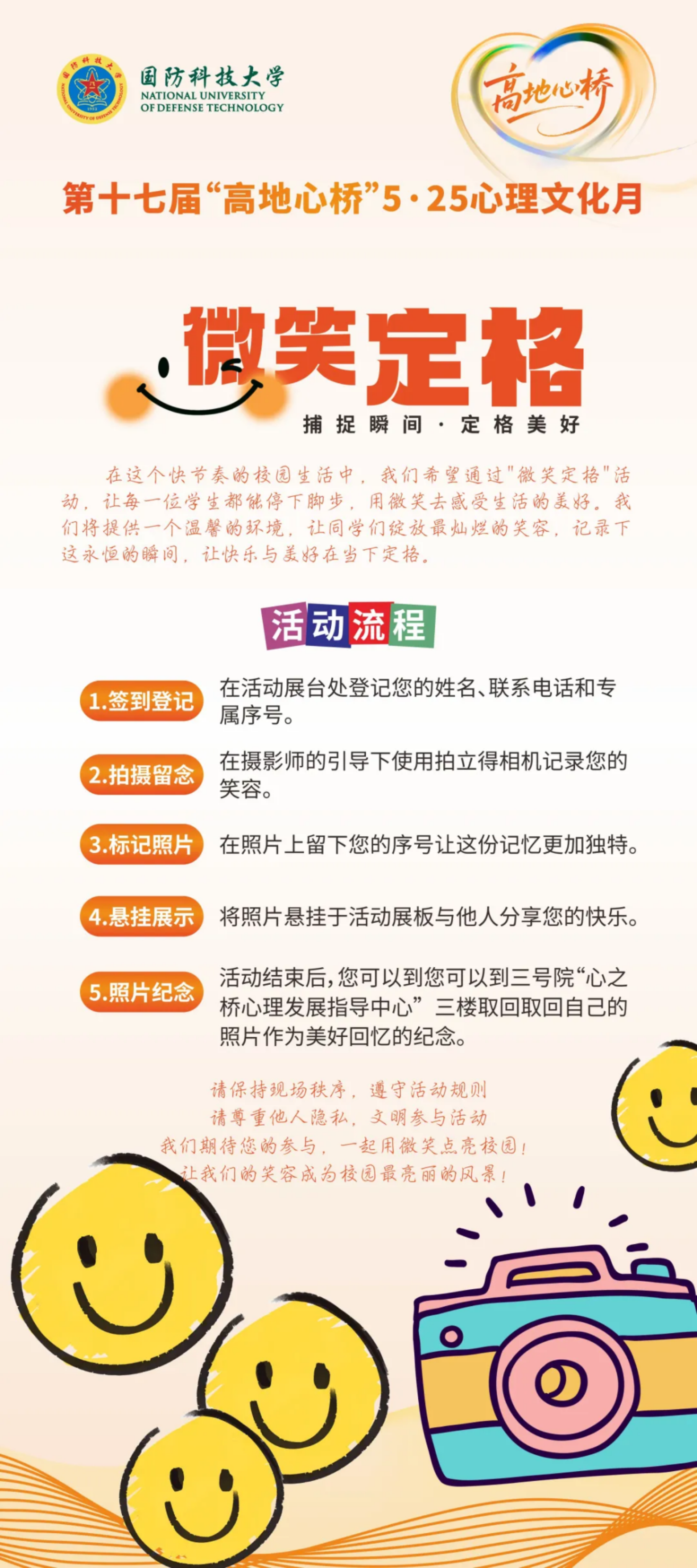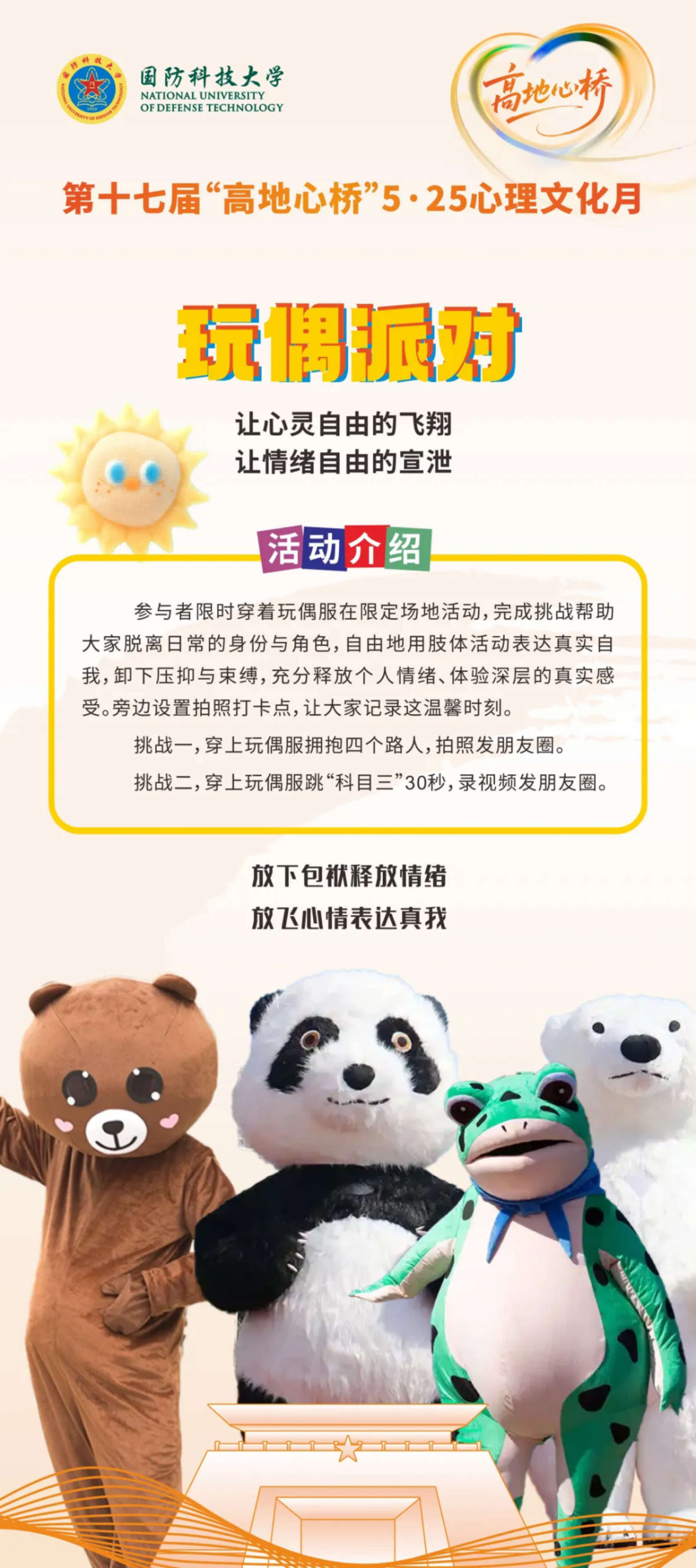 这场“五色光影”与高地文化的碰撞,不仅让师生们卸下疲惫、拥抱自我,更将科大的坚韧意志与人文温度完美融合。心若轻盈,征途便洒满阳光。NUDTer!愿你们在强军兴国的舞台上,始终心怀阳光、自信坚定,以强健的心理素质书写更精彩的篇章!