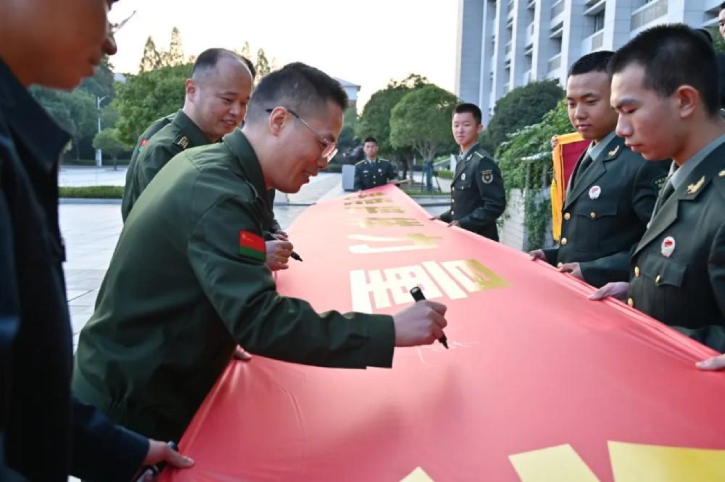 和着经过广场队列的嘹亮口号声