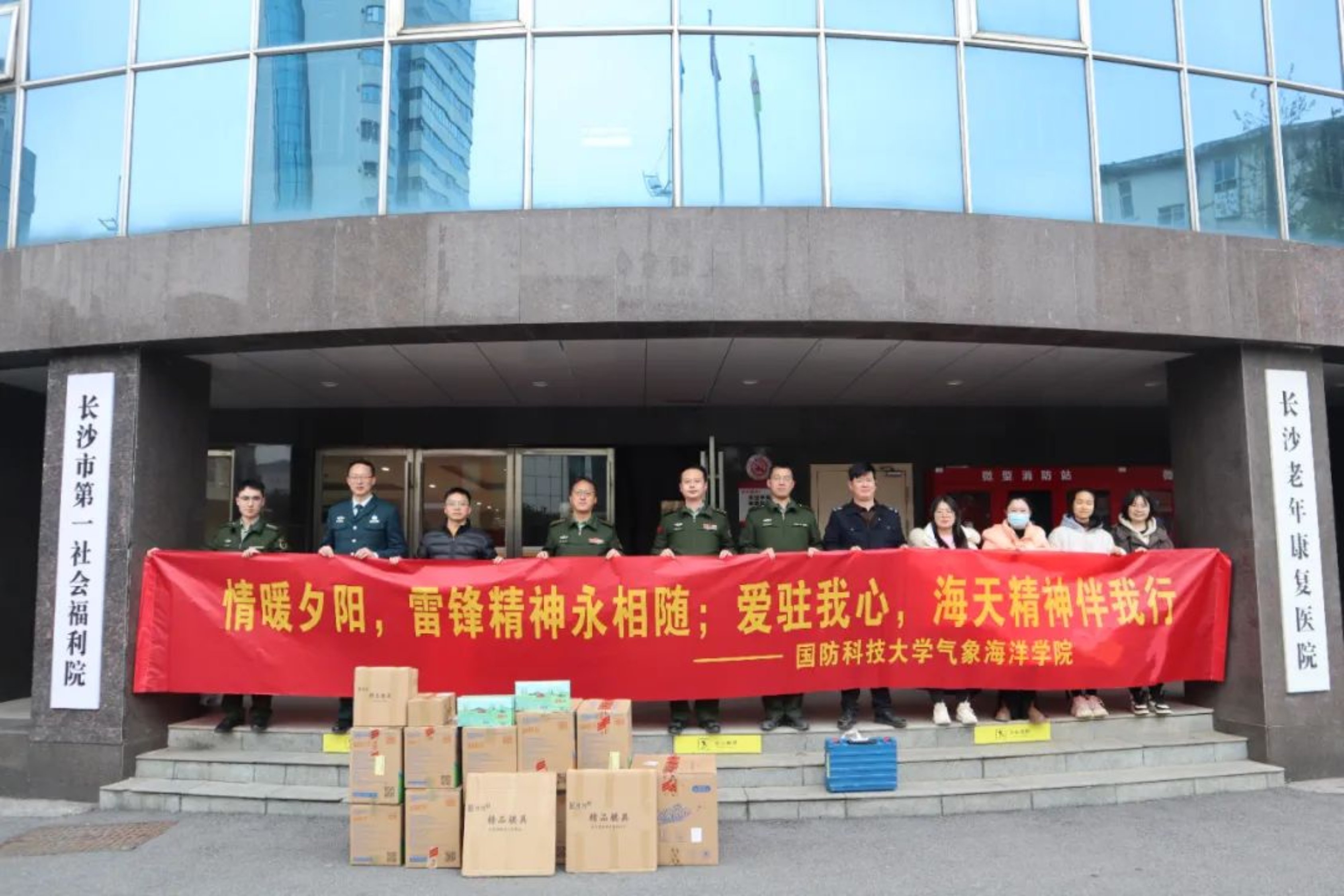气象海洋学院志愿者们来到长沙市第一社会福利院开展“情暖夕阳,雷锋精神永相随;爱驻我心,海天精神伴我行”学雷锋献爱心主题活动。志愿者们向敬老院赠送了慰问品,与老人们一起拉家常,帮忙将福利院内老旧待维修的桌椅、电器进行维修,打扫老年大学教室卫生。