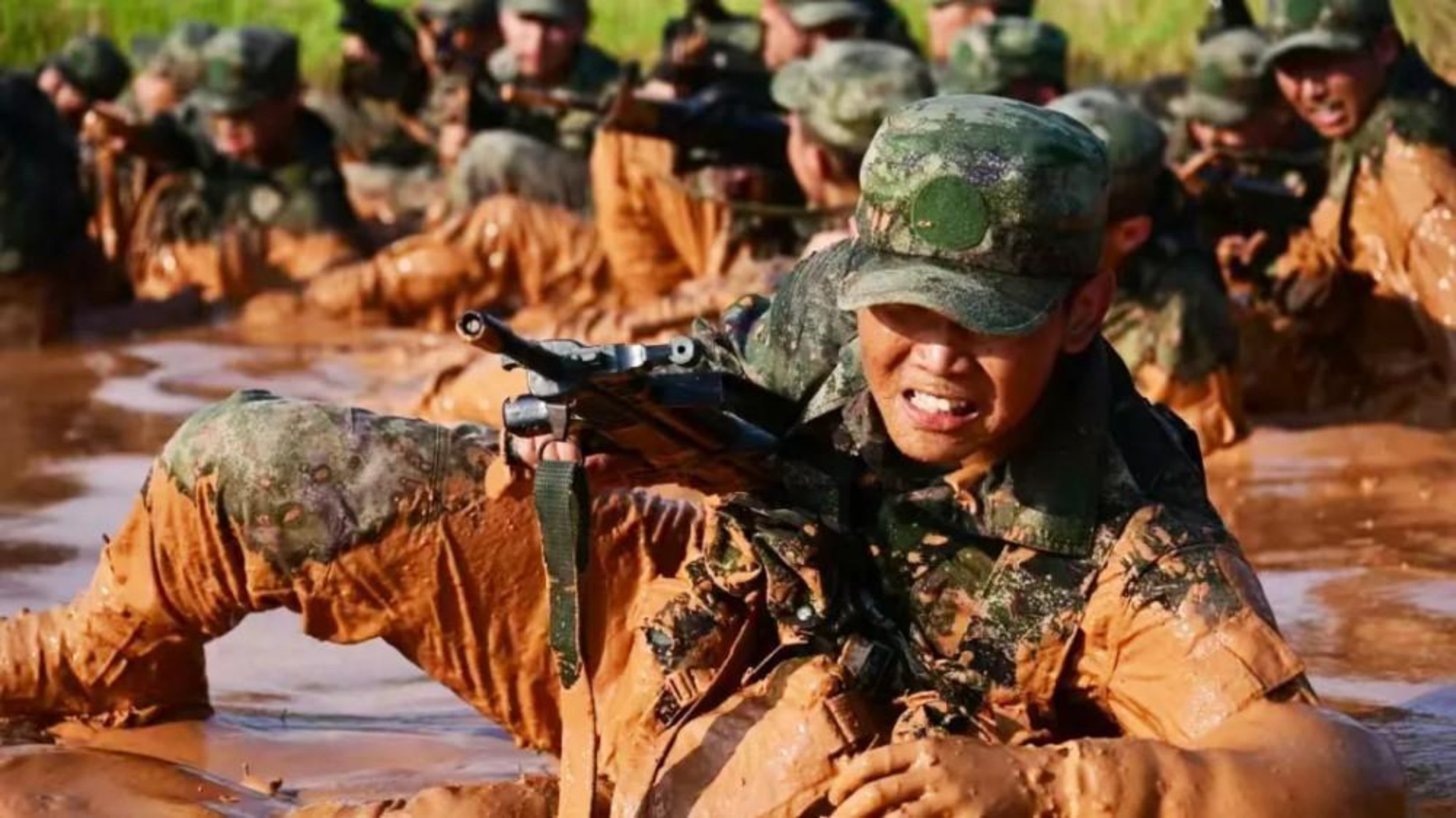 近日,军政基础教育学院组织2025级军人学员开展军事技能科目综合演练。图为学员匍匐通过泥泞地段。(李炟锰)