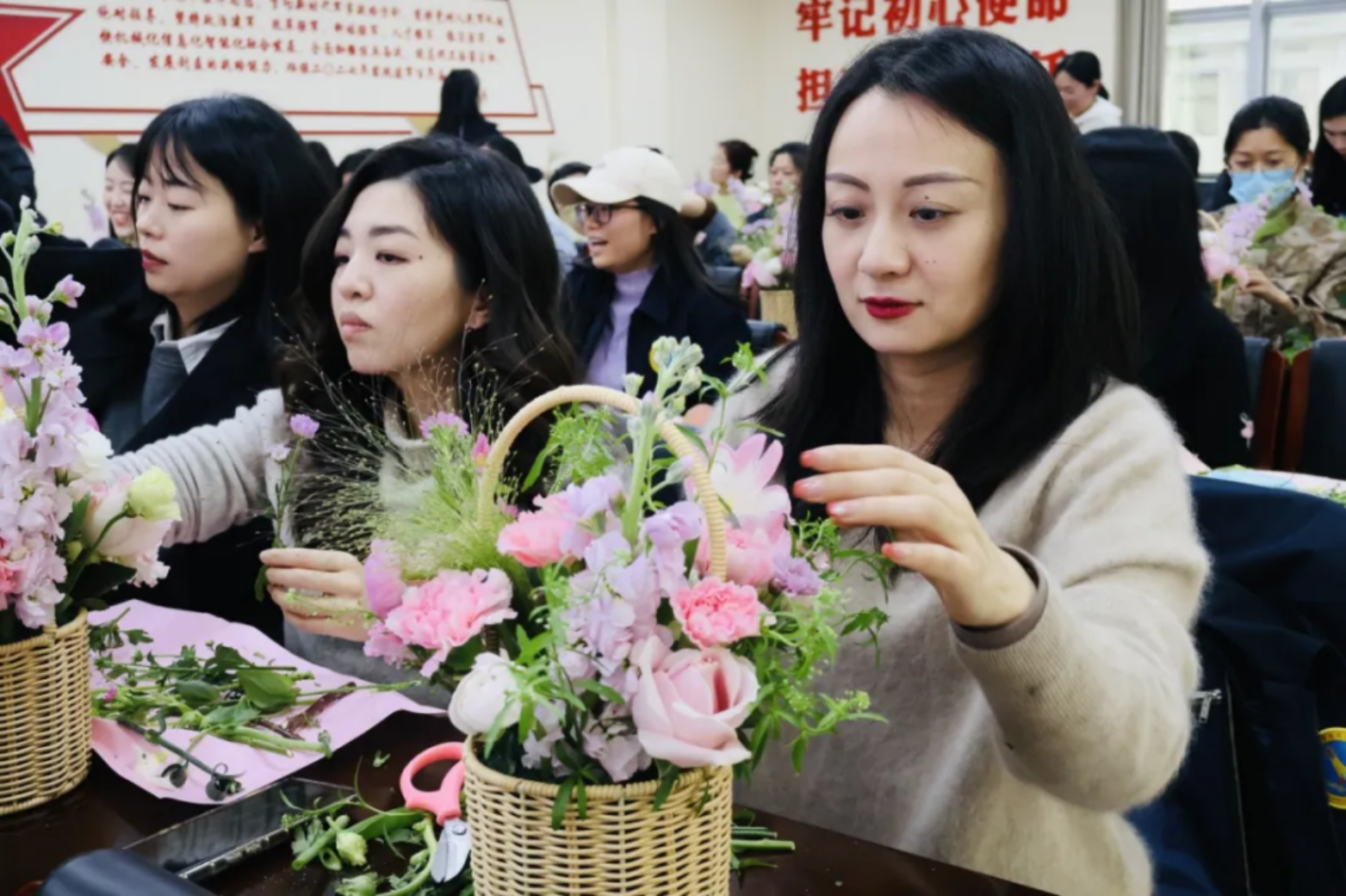 智能科学学院举办"设计美·留住美"插花DIY活动,女教职工在花艺师指导下制作花篮,用镜头定格美好瞬间;“她力量·共成长”茶话会上,女教授、讲师与博士生畅聊学术心得,已毕业师姐分享求职“秘籍”。活动既传递温暖关怀,更激励女性师生在岗位上绽放光彩,为学院发展贡献巾帼力量。