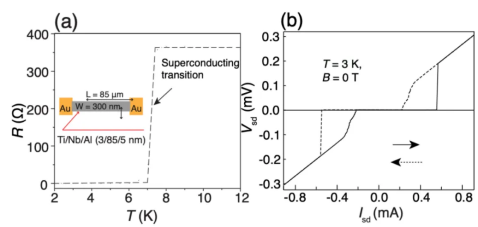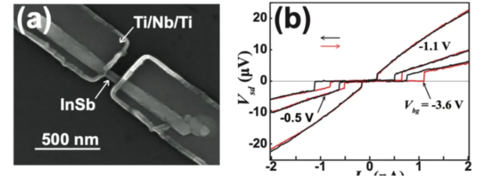 图3展示鲲腾团队制作的一个约瑟夫森结器件,中间采用半导体材料夹在两块超导体之间构成。右图中的电流-电压曲线测试结果显示,电流依然无阻尼地穿越了整个器件!