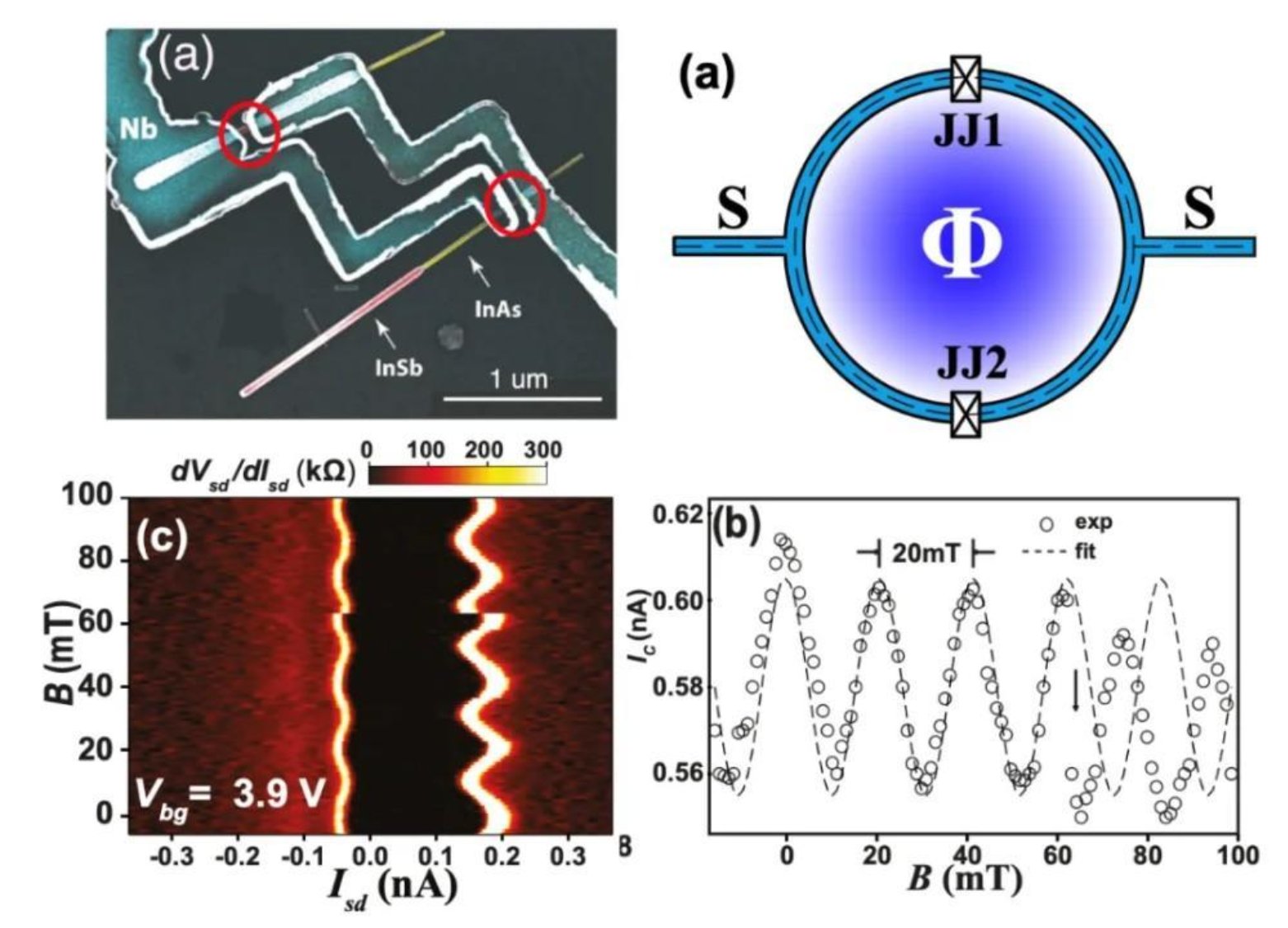 那么,含有两个约瑟夫森结的SQUID又有什么特别之处呢?答案是它构成了一个具有相干特性的干涉器件。图4展示了鲲腾团队制作的SQUID器件在改变穿过环路的磁场(即磁通)时,超导电流出现了周期性振荡行为,如同双缝干涉实验中的明暗条纹,这个实验证明了超导中存在着宏观量子波函数。