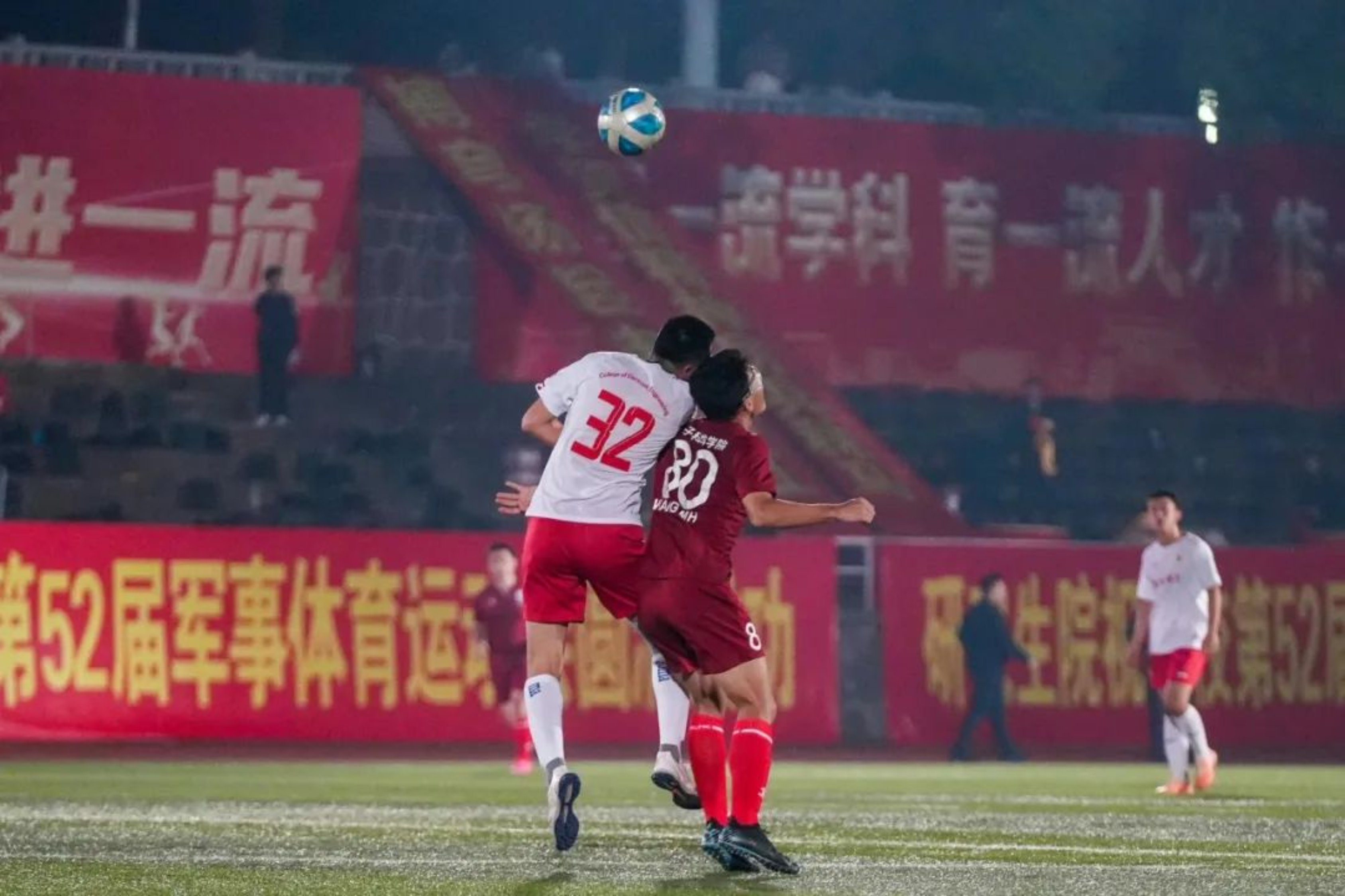 现场战斗迅速进入白热化阶段,双方你来我往、每球必争,很长时间内两队比分在零比零胶着,临近上半场尾声,电子对抗学院首先抓住一次角球机会,在所有人的紧张注视下,卢波屏息凝神,高高跃起,以迅雷不及掩耳之势头槌破门夺得首分,将上半场的比分更改为1:0。