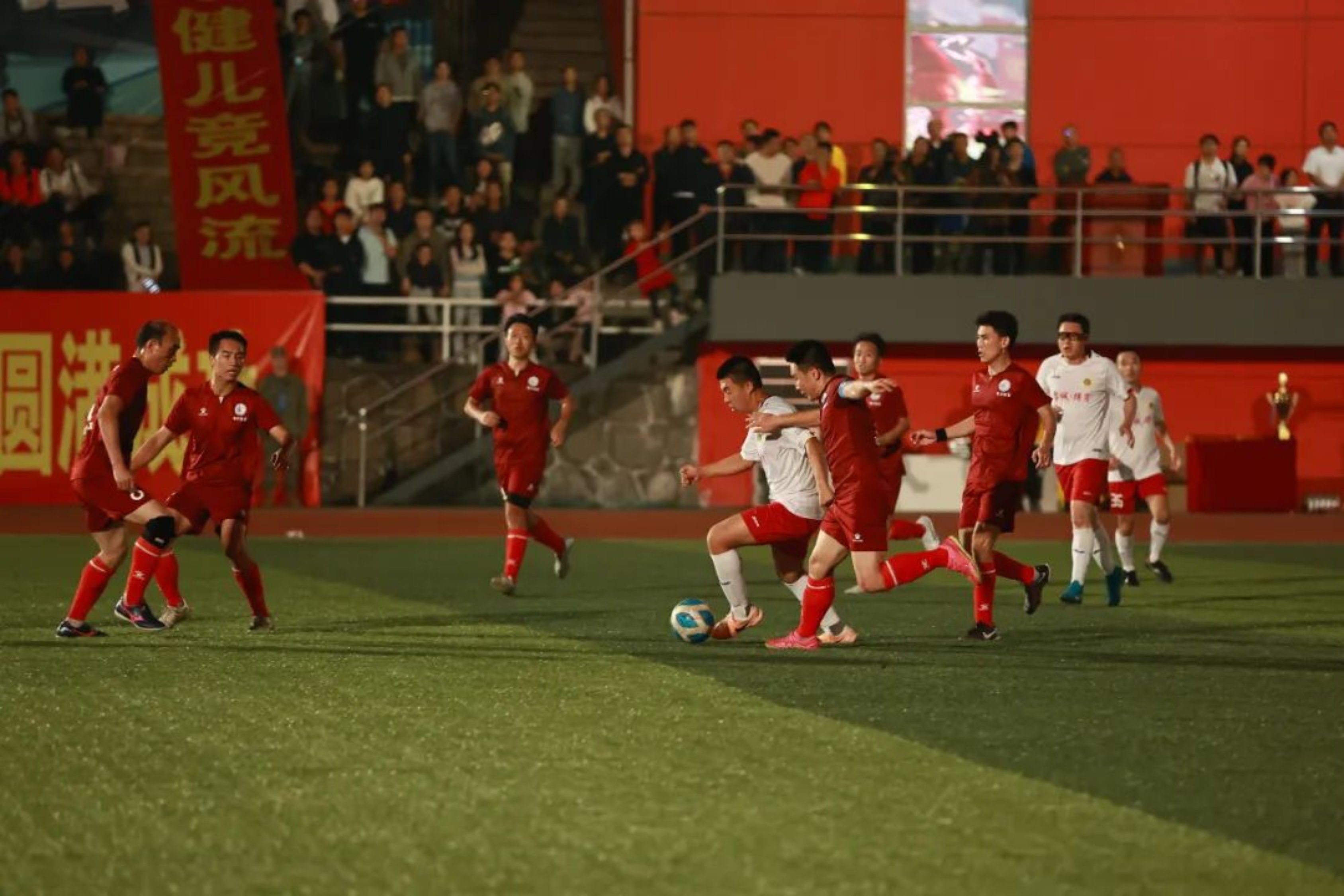 时间一分一秒流逝,不知不觉比赛进入下半场的后半段,双方球员虽然体力透支严重,但拼抢强度丝毫不减 ,场上氛围也更加热烈,他们珍惜每一次机会,争取破门得分。每个人都为胜利拼尽全力,用激情和汗水传达着对足球运动的热爱。保障人员也热情如火,擂鼓助威,呐喊声一浪高过一浪。整场比赛组织有序,双方的团队精神和拼搏态度受到了观众的一致好评。