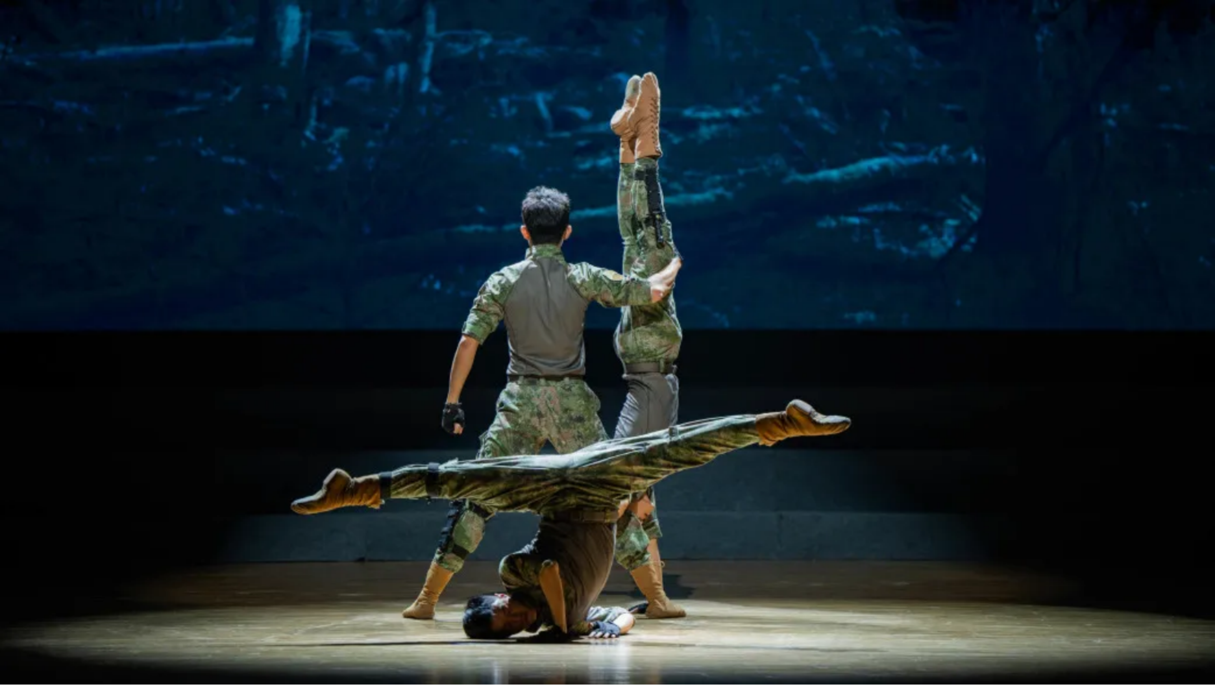 腾空、旋转、跳跃……舞蹈《尖兵》用一系列高难度的技巧动作展现了官兵在艰苦环境和极限挑战下的训练生活,激情演绎出全体官兵敢打必胜的信念和一往无前的战斗意志。