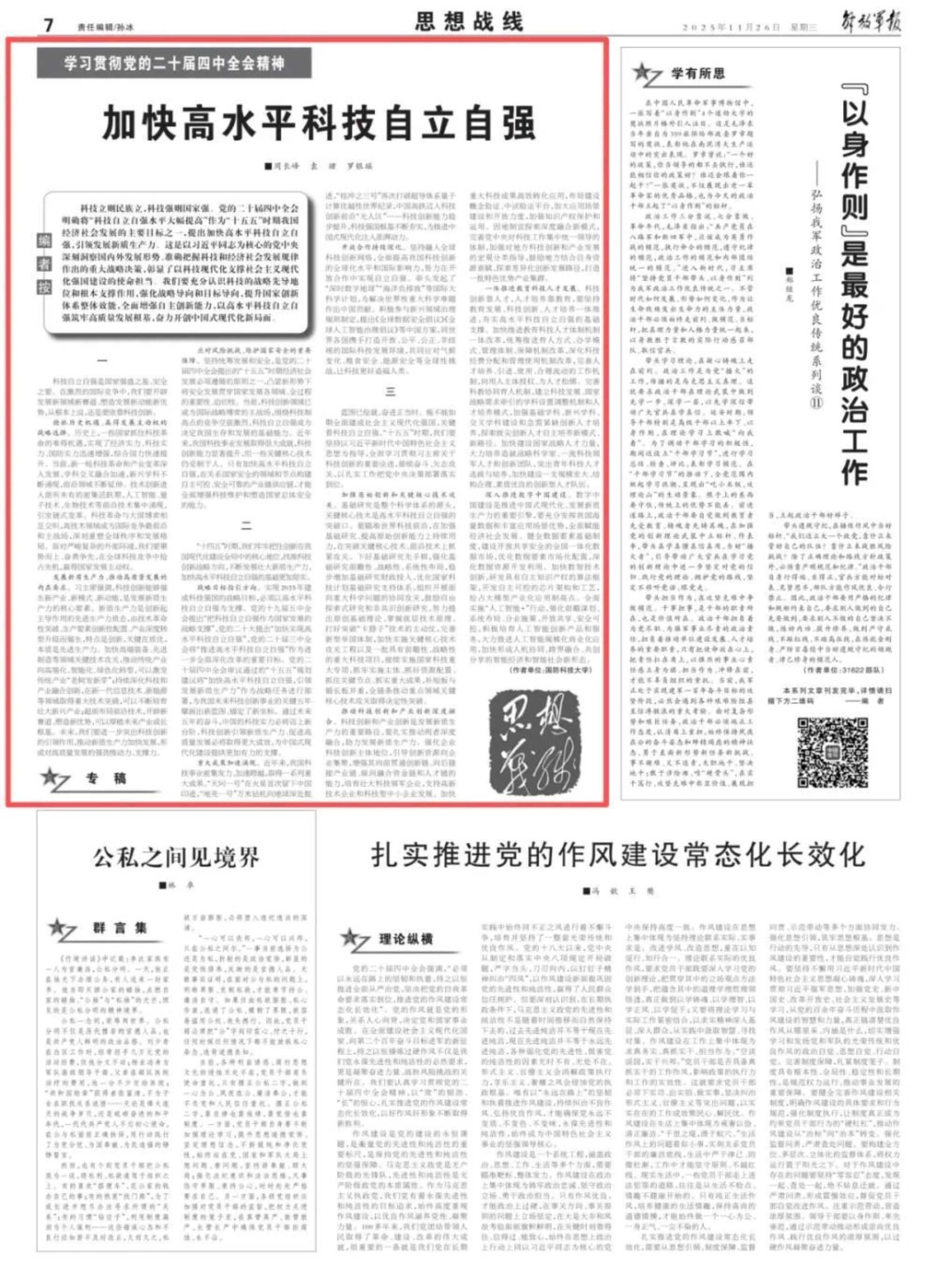 科技立则民族立,科技强则国家强。党的二十届四中全会明确将“科技自立自强水平大幅提高”作为“十五五”时期我国经济社会发展的主要目标之一,提出加快高水平科技自立自强,引领发展新质生产力。这是以习近平同志为核心的党中央深刻洞察国内外发展形势、准确把握科技和经济社会发展规律作出的重大战略决策,彰显了以科技现代化支撑社会主义现代化强国建设的使命担当。我们要充分认识科技的战略先导地位和根本支撑作用,强化战略导向和目标导向,提升国家创新体系整体效能,全面增强自主创新能力,以高水平科技自立自强筑牢高质量发展根基,奋力开创中国式现代化新局面。