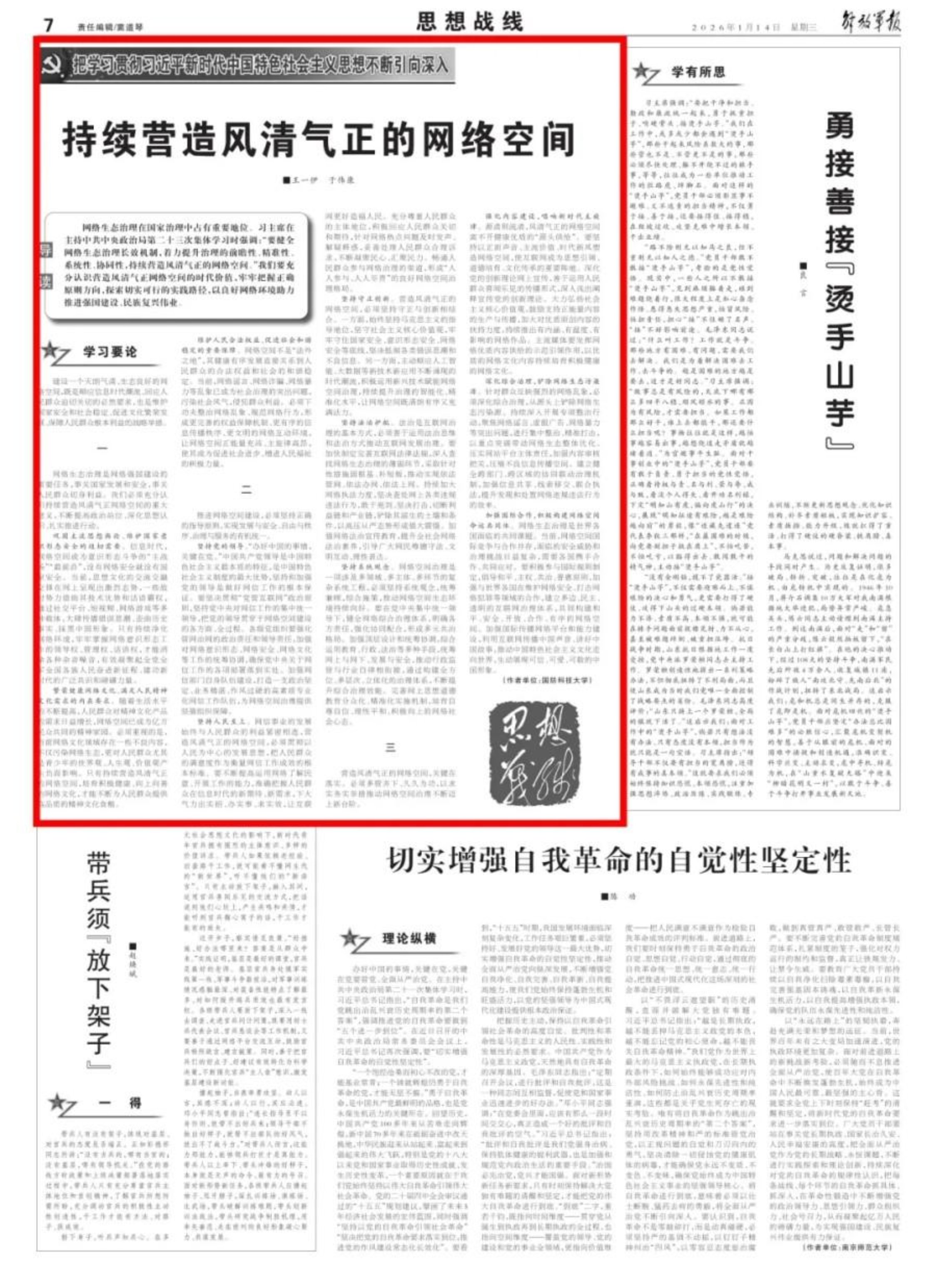 网络生态治理在国家治理中占有重要地位。习主席在主持中共中央政治局第二十三次集体学习时强调:“要健全网络生态治理长效机制,着力提升治理的前瞻性、精准性、系统性、协同性,持续营造风清气正的网络空间。”我们要充分认识营造风清气正网络空间的时代价值,牢牢把握正确原则方向,探索切实可行的实践路径,以良好网络环境助力推进强国建设、民族复兴伟业。