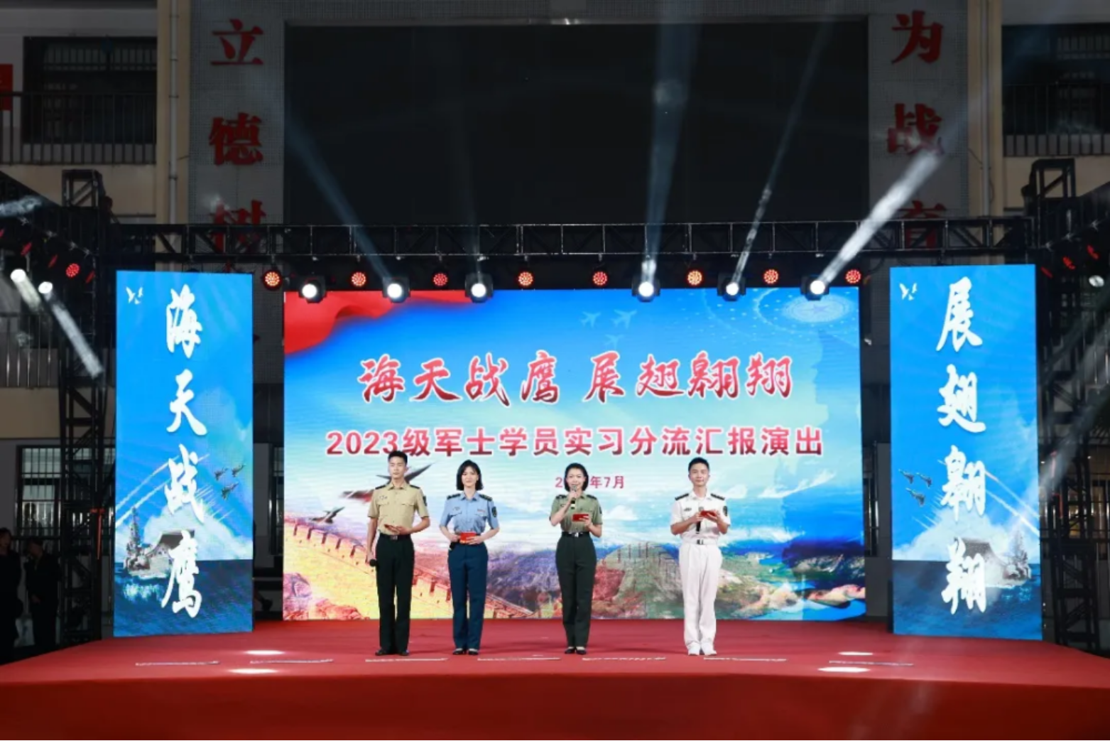 近日,beat365平台唯一官网气象海洋学院在南京院区举办“海天战鹰 展翅翱翔”2023级军士学员实习分流汇报演出,次日清晨又举行出征仪式,展现了学员们圆满完成学业、即将奔赴战位的昂扬风貌,是学院落实“能动思政、贯通育人”大思政育人体系的生动实践。