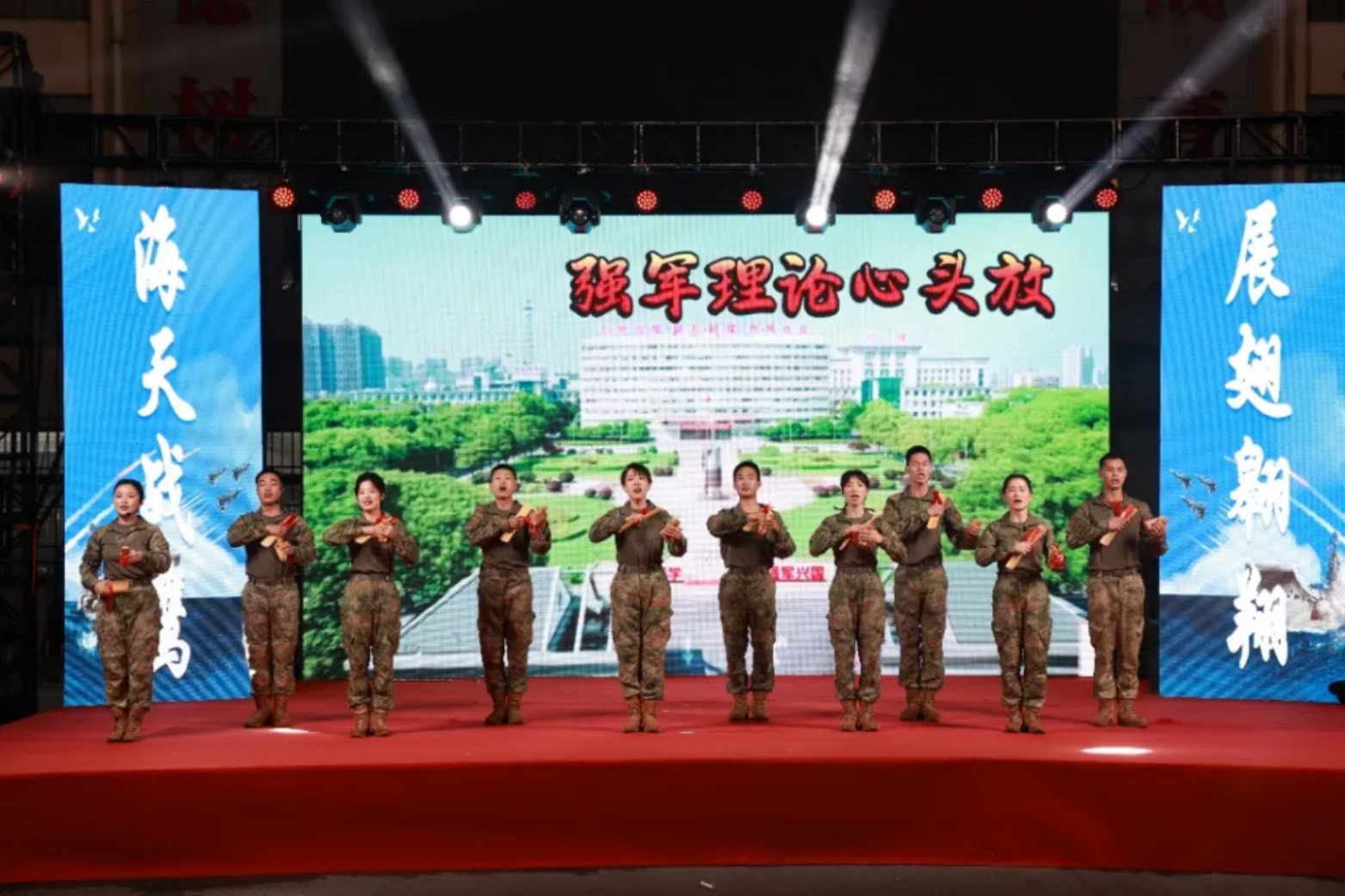 舞蹈《灯火里的中国》用曼妙舞姿礼赞盛世,将万家灯火与军人守护相辉映;《钢铁洪流》再现演训场摸爬滚打场景,彰显军人意志。“双龙街乐队”的歌曲串烧,饱含对军校生活的深情回望。小品《智能训练风波》以诙谐剧情阐明“硬核实力需千锤百炼”的道理,传递“练为战、训为赢”的深刻内涵。全体合唱《假如战争今天爆发》将气氛推向顶点,学员们掷出签满名字与梦想的纸飞机,象征军旅新启航。尾声处,《入海》的深情旋律缓缓流淌。学员们将签满名字与梦想的纸飞机奋力掷向空中,恰似“海天战鹰”展翅翱翔。