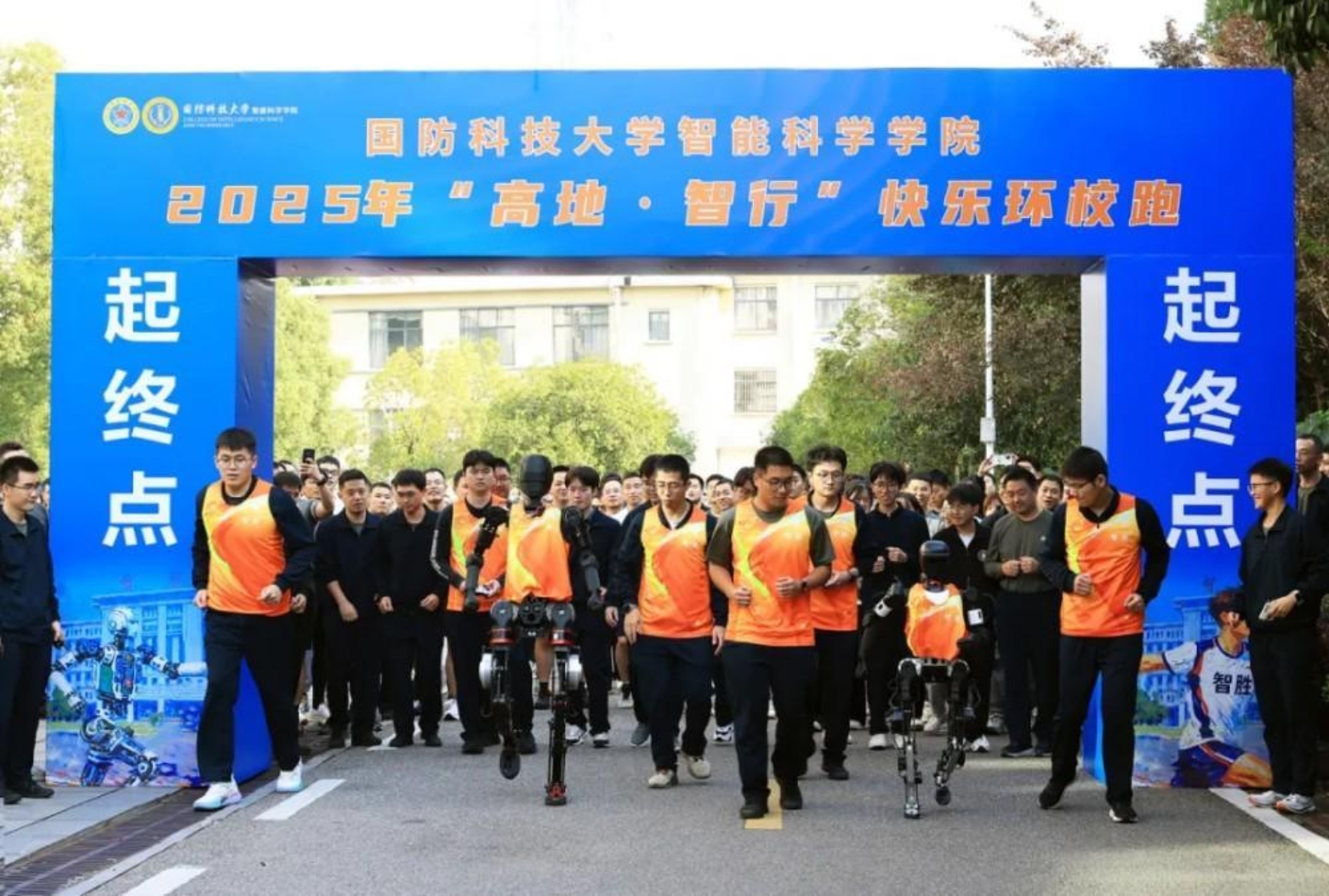 近日,智能科学学院举办2025年“高地·智行”快乐环校跑活动,学院自主研发的“智行者”机器人与师生员工共同参加。图为活动现场。(杨思涵、张晨希)