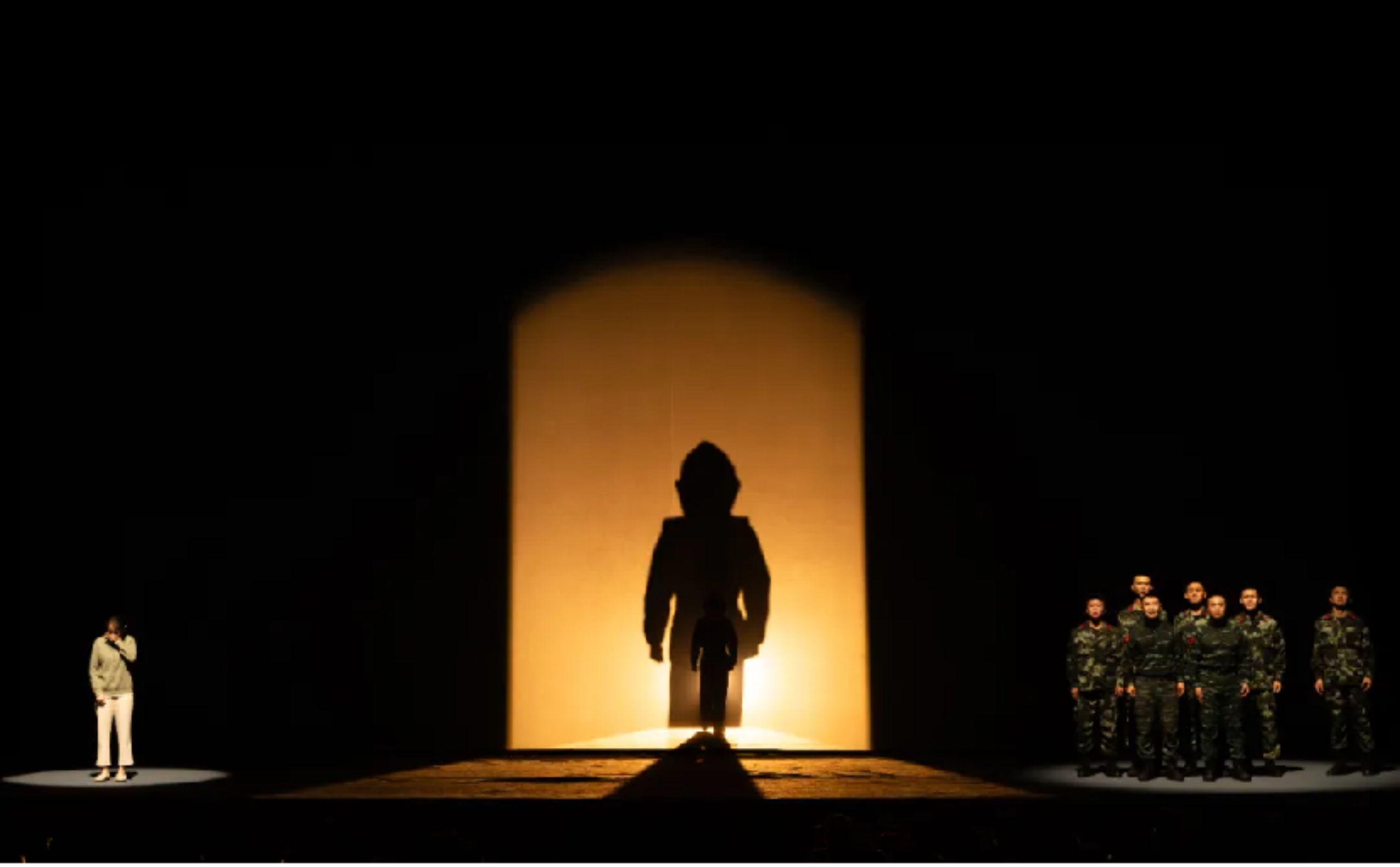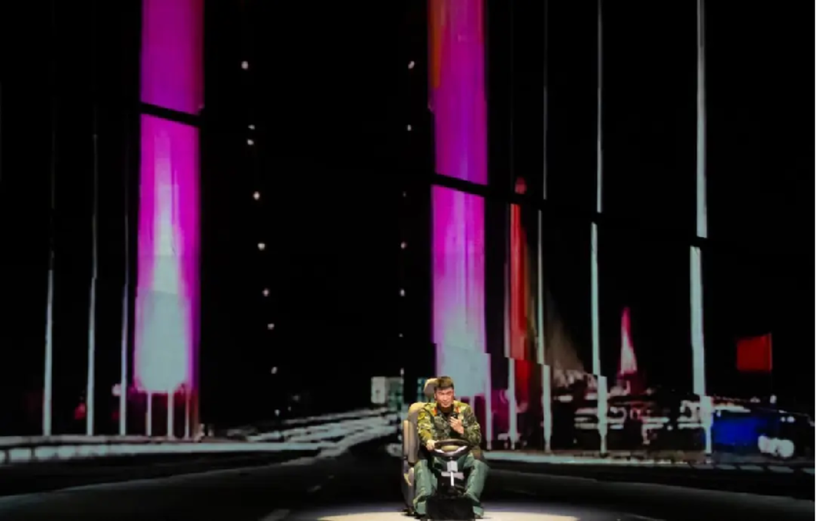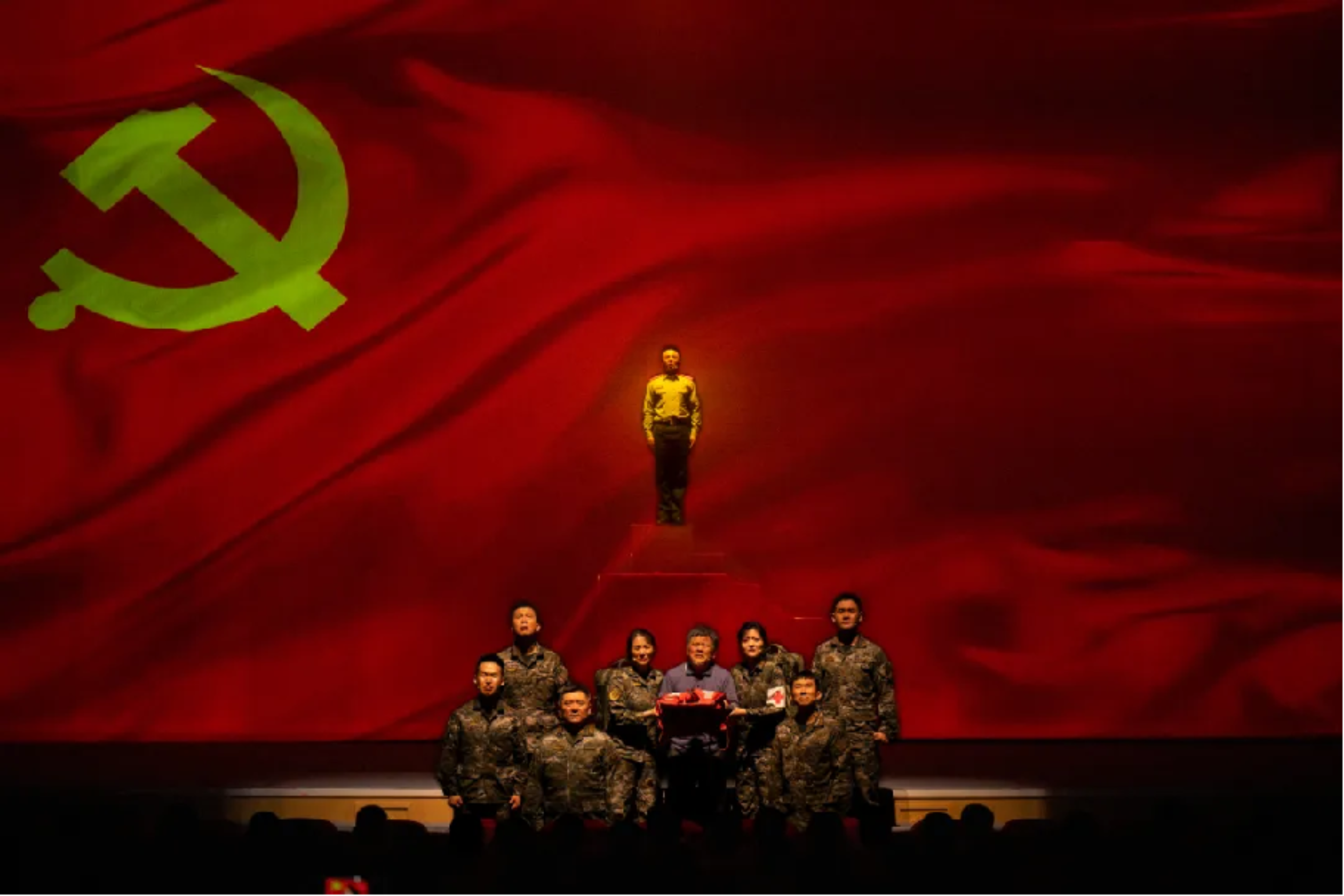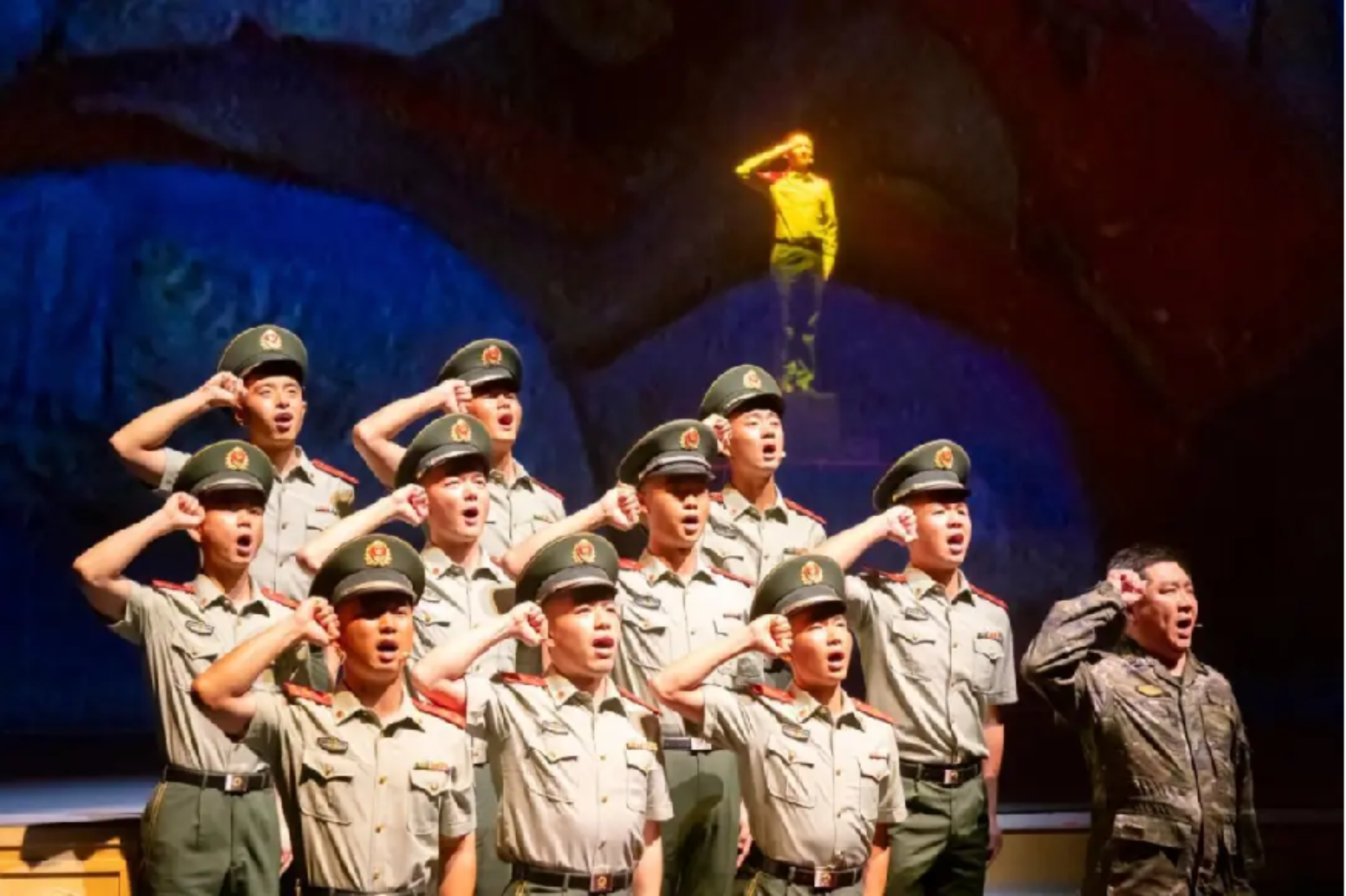 舞台上,孙明礼在战友的追忆里高举右手向党旗宣誓,此时,原型人物剪影也在大屏幕上浮现。这一幕,让不少学员落下泪来。