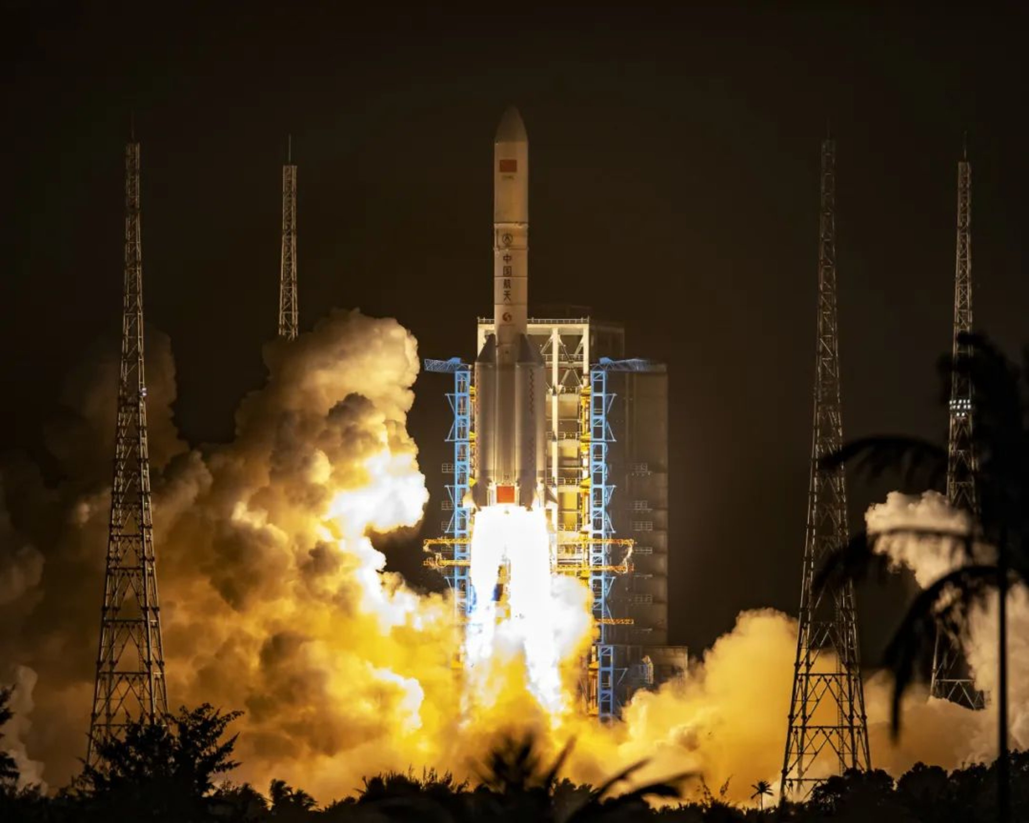 “轰隆——”慕然间,天地骤明,大地震颤,长征五号遥六运载火箭被绚烂尾焰推举着腾空而起,划破夜空。
