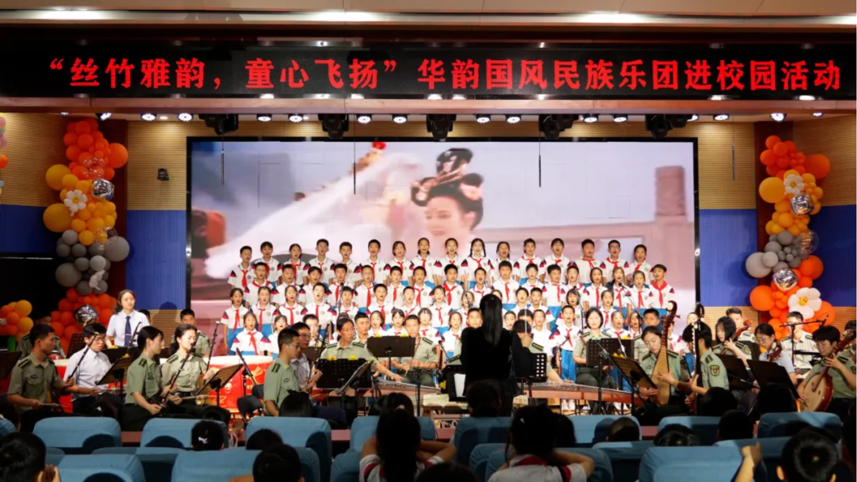 近日,六一”国际儿童节,学校华韵国风民乐团与附属小学携手共庆,以民乐音乐会的方式为佳节献上精彩乐章。图为活动现场。(王睿婷、黎光炫)