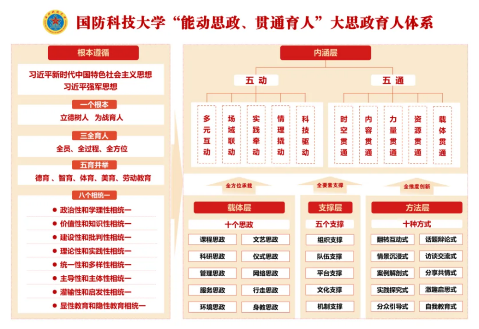 学校党委近日印发的《深化构建学校“能动思政、贯通育人”大思政育人体系的措施》明确指出,坚持立德树人、为战育人,落实“政治+军事+科技+文化”育人理念,坚持德、智、体、美、劳“五育”并举。“四维一体”“五育并举”从理念思路、育人目标、实践路径三个维度,构建起大思政育人体系的核心内容,既呈现出鲜明的时代特征、军队特点、科大特色,又直面信息时代智能化战争挑战,为“能动思政、贯通育人”大思政体系的抓建提供了方法论支撑。
