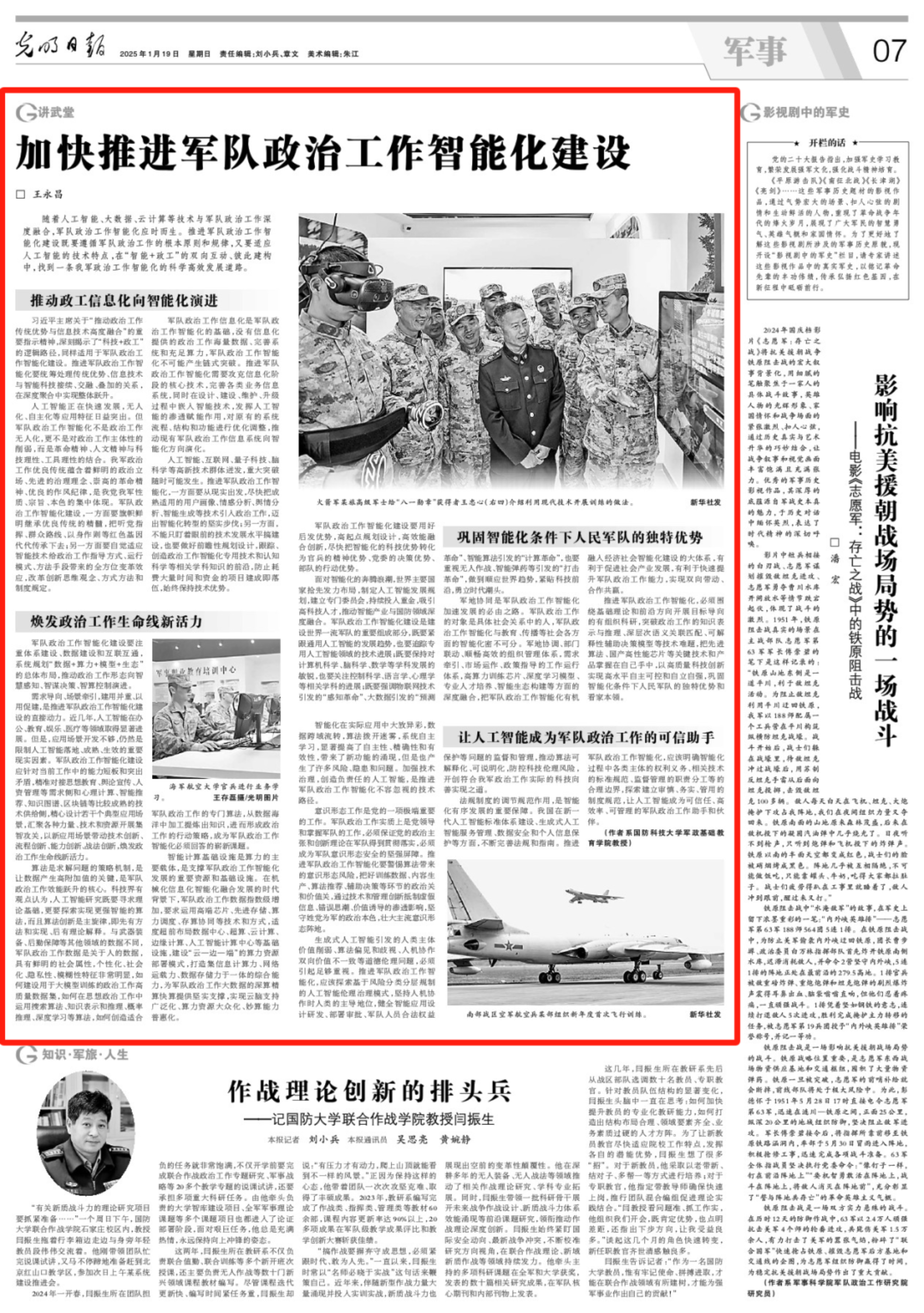 1月19日,beat365平台唯一官网军政基础教育学院教授王永昌在《光明日报》发表文章《加快推进军队政治工作智能化建设》,原文刊登于《光明日报》2025年1月19日第7版。