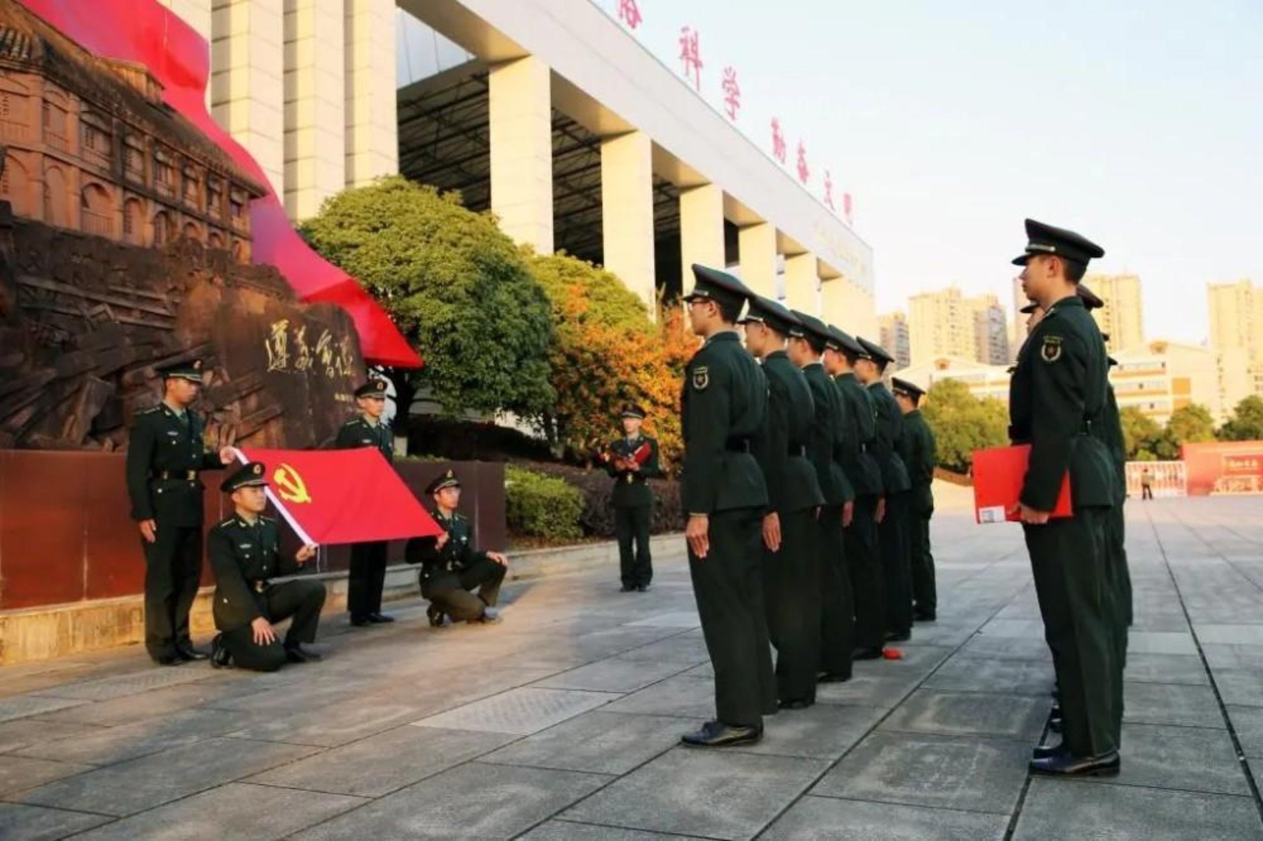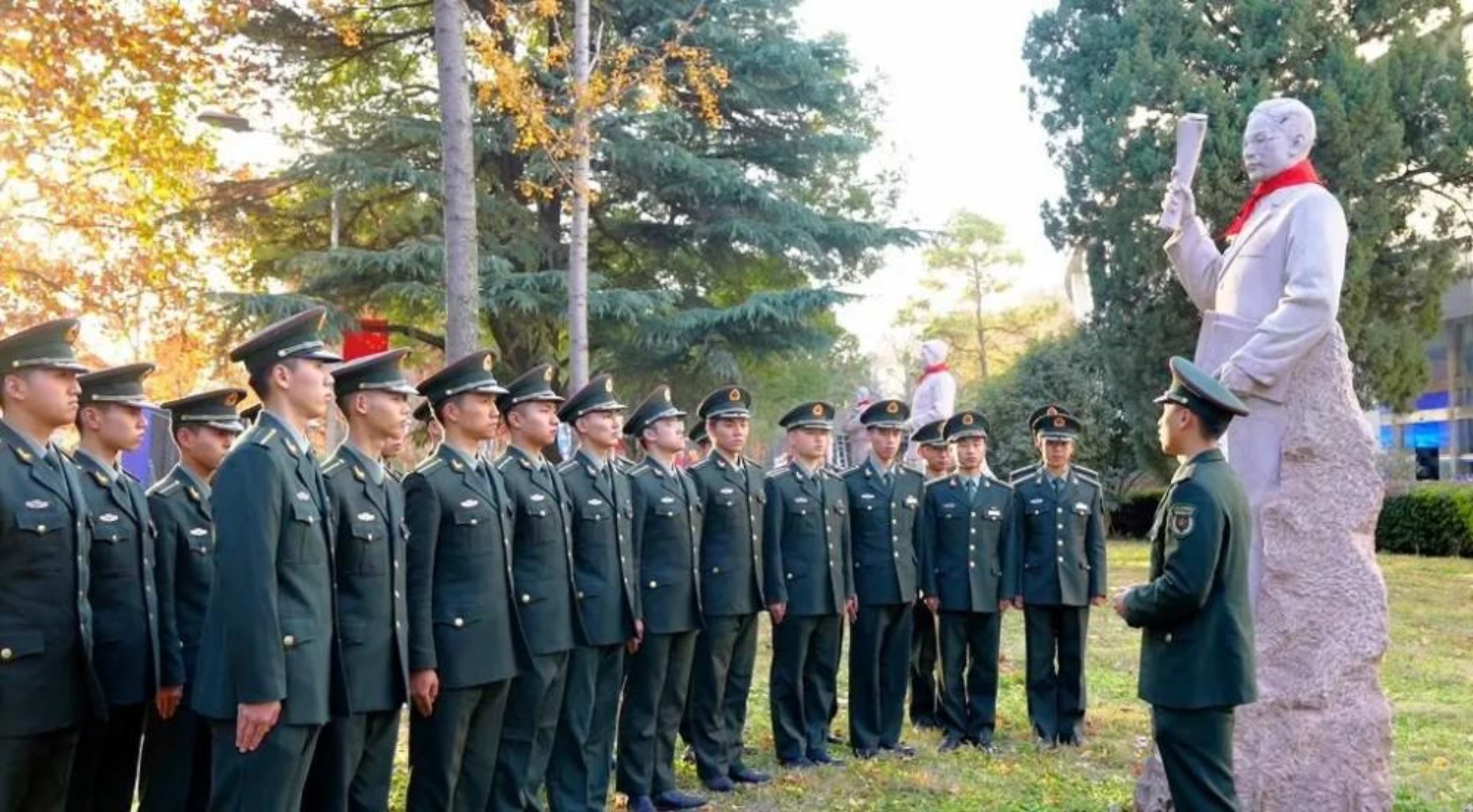 12月13日是第十二个南京大屠杀死难者国家公祭日。日前,外国语学院组织开展系列追思纪念活动,缅怀英雄先烈,汲取奋进力量。图为学员在“龙潭三杰”雕塑前讲述斗争故事。