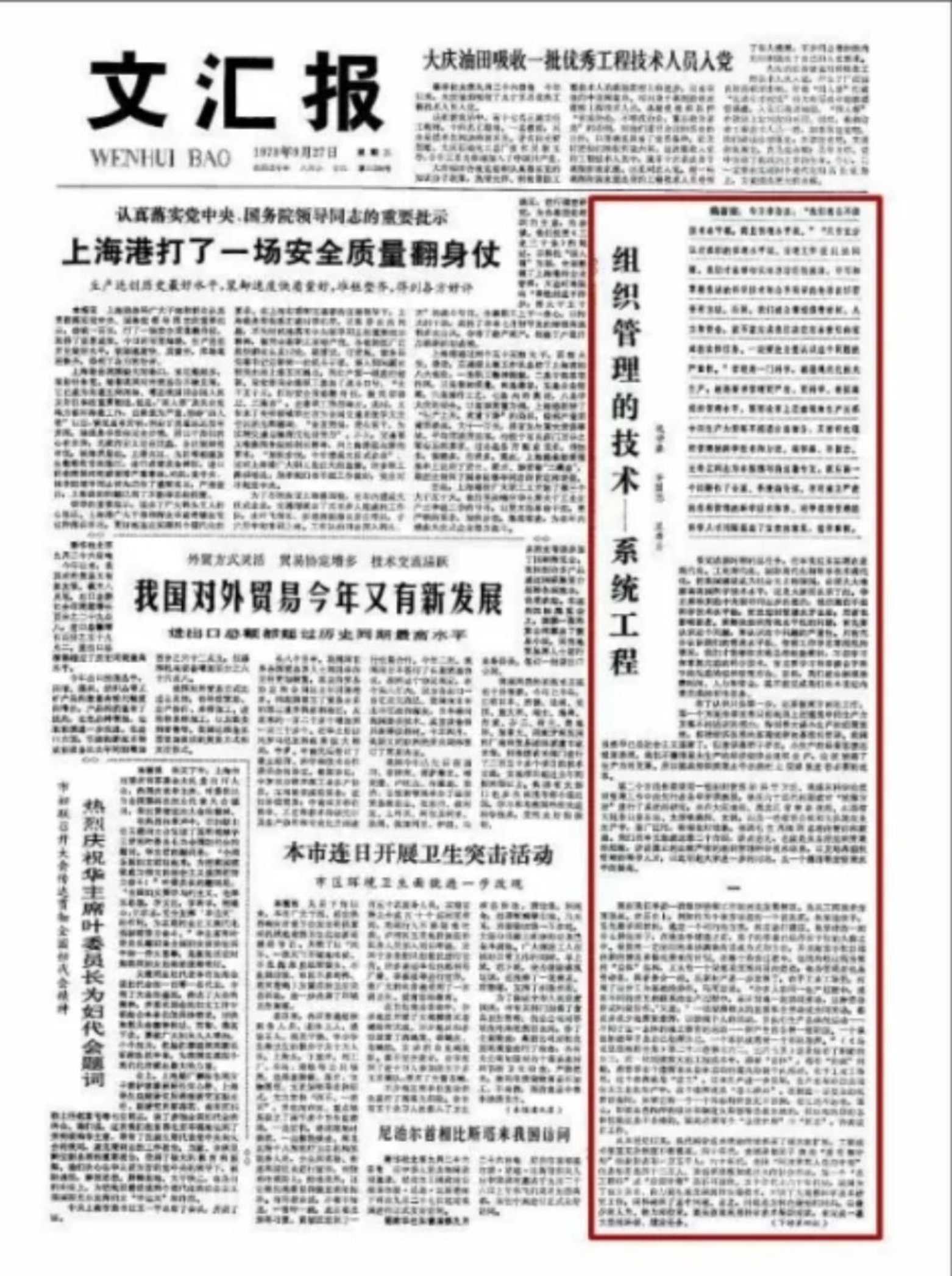 文章首次系统地阐述了系统工程的概念、内涵及其应用前景,指出系统工程是一种科学方法,适用于所有“系统”的规划、研究、设计、制造、试验和应用。这篇文章掀起了全国研究和应用系统工程的热潮,促进了系统工程在中国的发展。