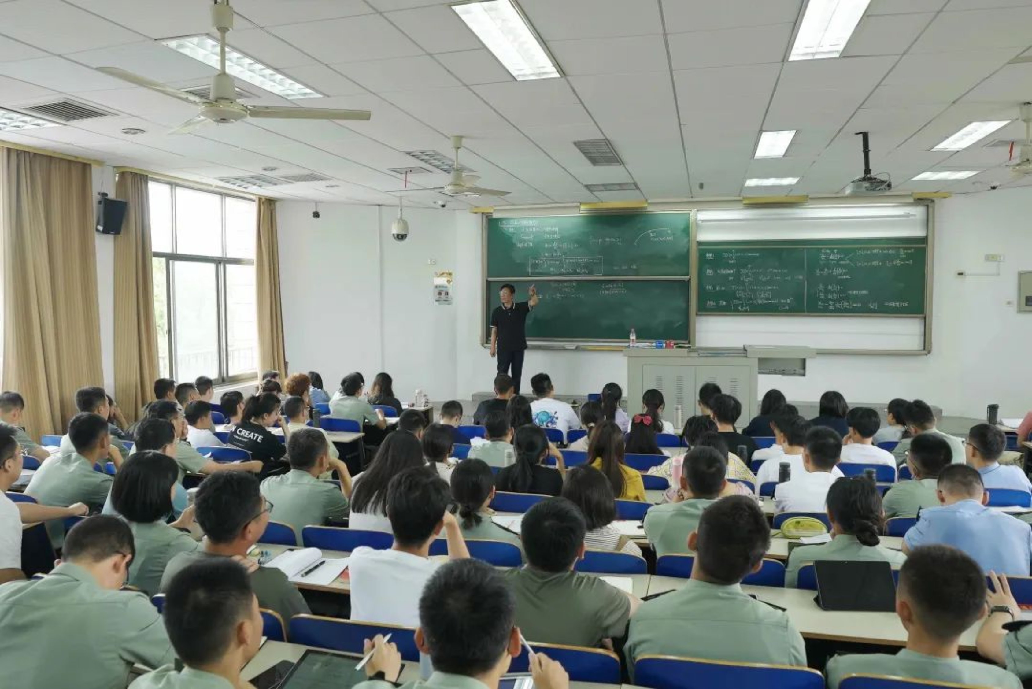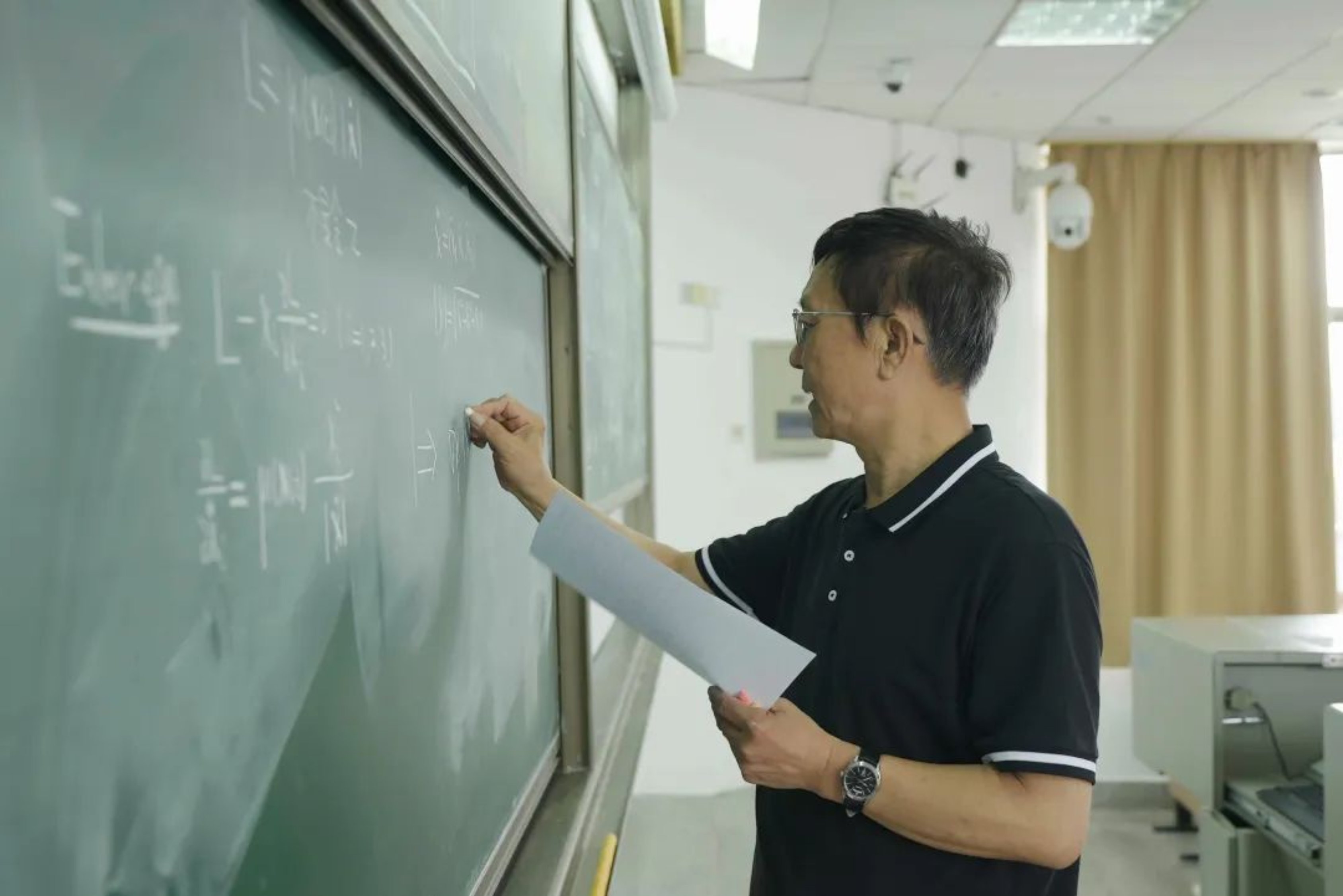 手写的讲义,手写的板书,没有电脑、更没有PPT课件。挑起一根粉笔,一转身空白的黑板上出现了仿佛印刷体一般的三个公式和一幅示意图。一整套动作行云流水,利落干脆。