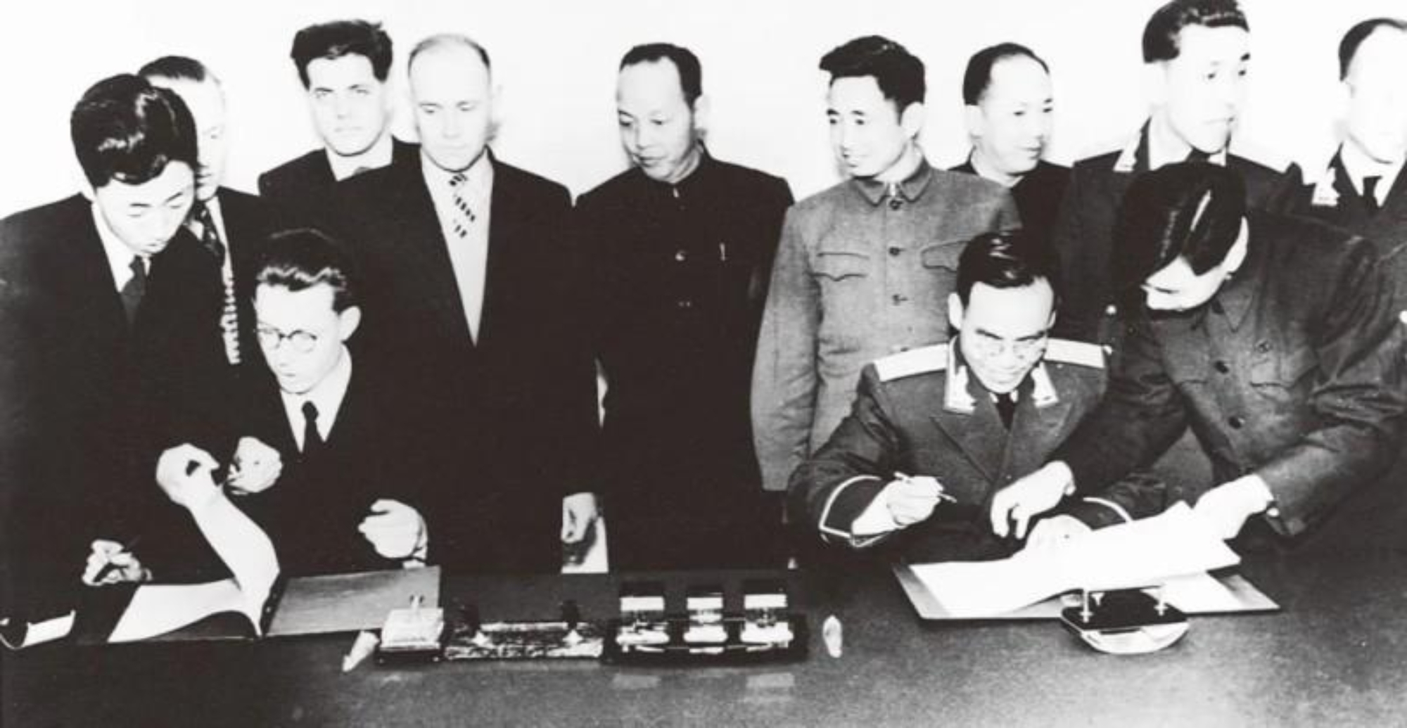 1956年底,任新民(前排右二)作为中方代表在P-1近程弹道导弹交接仪式上签字。