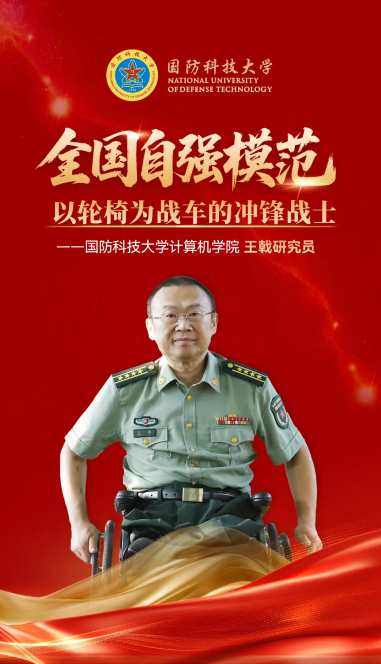 2013年1月,王戟因工作劳累,突发主动脉夹层破裂,在经历了14小时的手术后,最终不得不双下肢高位截肢。现实并未将这位“战士”打倒,病情稳定后,他迅速投入教学科研一线。2021年,重返工作岗位六年的他,再次入院,从此每周都要进行3次血液透析治疗,开启了“病房-实验室-教室”三点一线的工作模式。虽然饱受病痛折磨,但王戟依然乐观向上、努力工作,每天驾着自己的“战车”,向着国防科技前沿、人才培养高地一次又一次发起冲锋。
