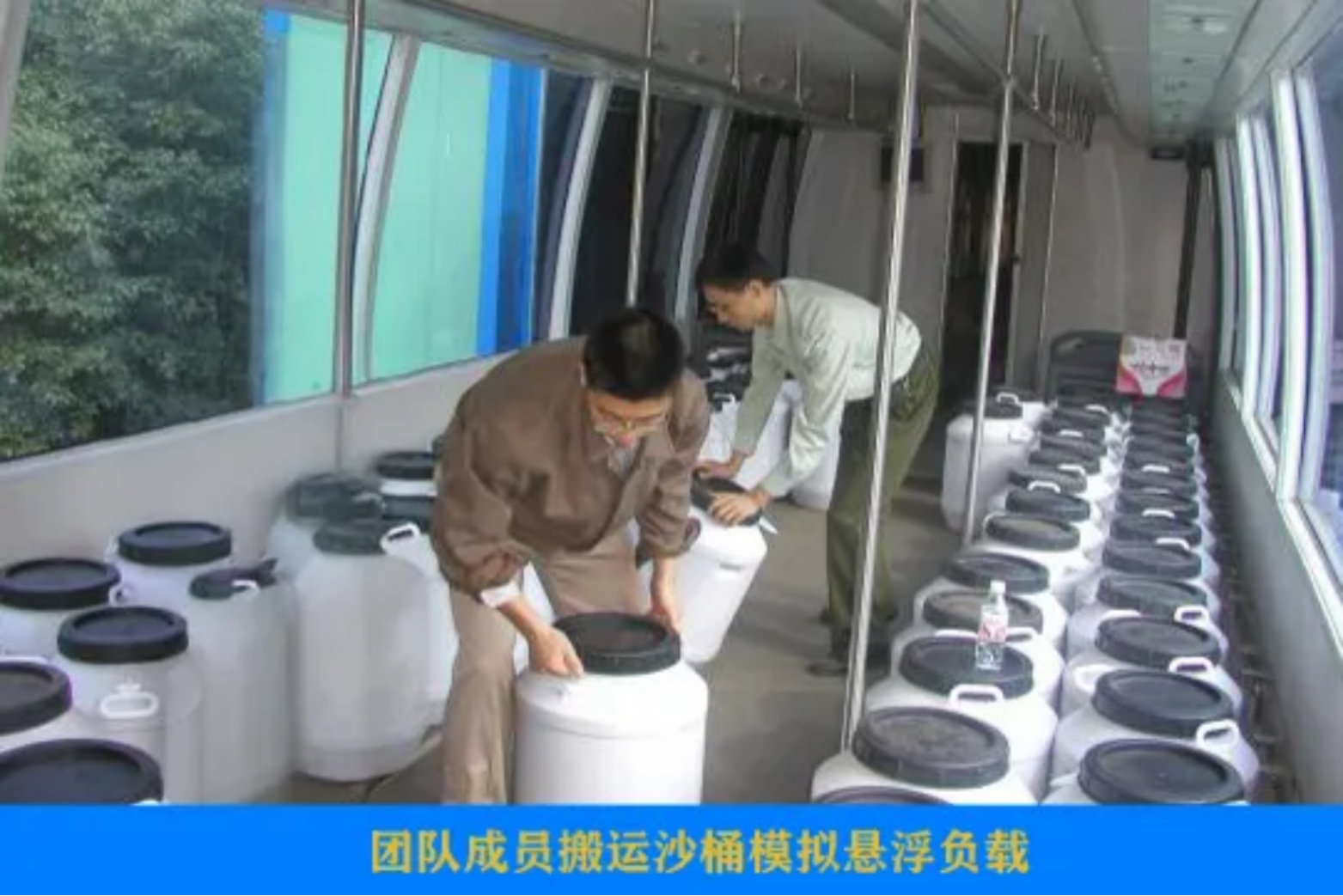 为了测试悬浮系统承载能力,团队采购了180只塑料桶,每只桶里装80kg沙子用来模拟列车负载。每改变一个控制算法,团队成员就开始前后左右、上上下下的抬沙桶。正是靠这种“人拉肩扛”的干劲,在试验线往返五个春秋,他们先后解决了磁浮列车随机振动、车轨耦合振动等世界性难题,实现了满载36吨的中国首辆中低速磁浮列车在204米试验线上平稳可靠运行。