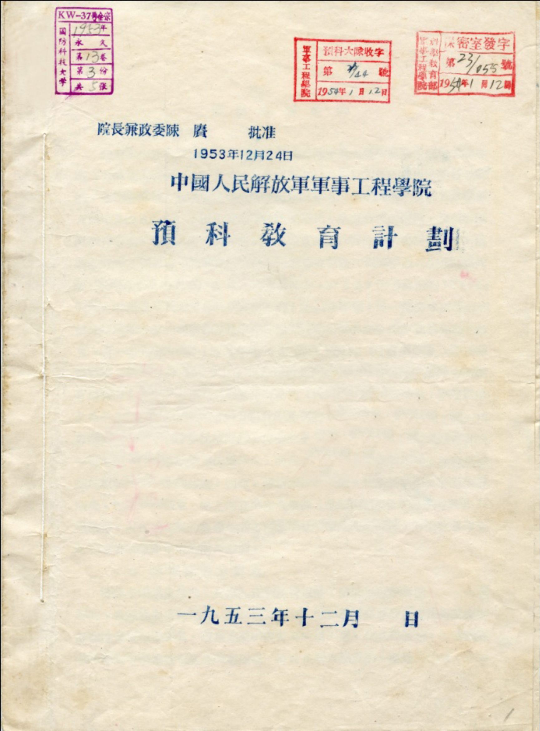 图为1953年12月学院制订的预科教育计划