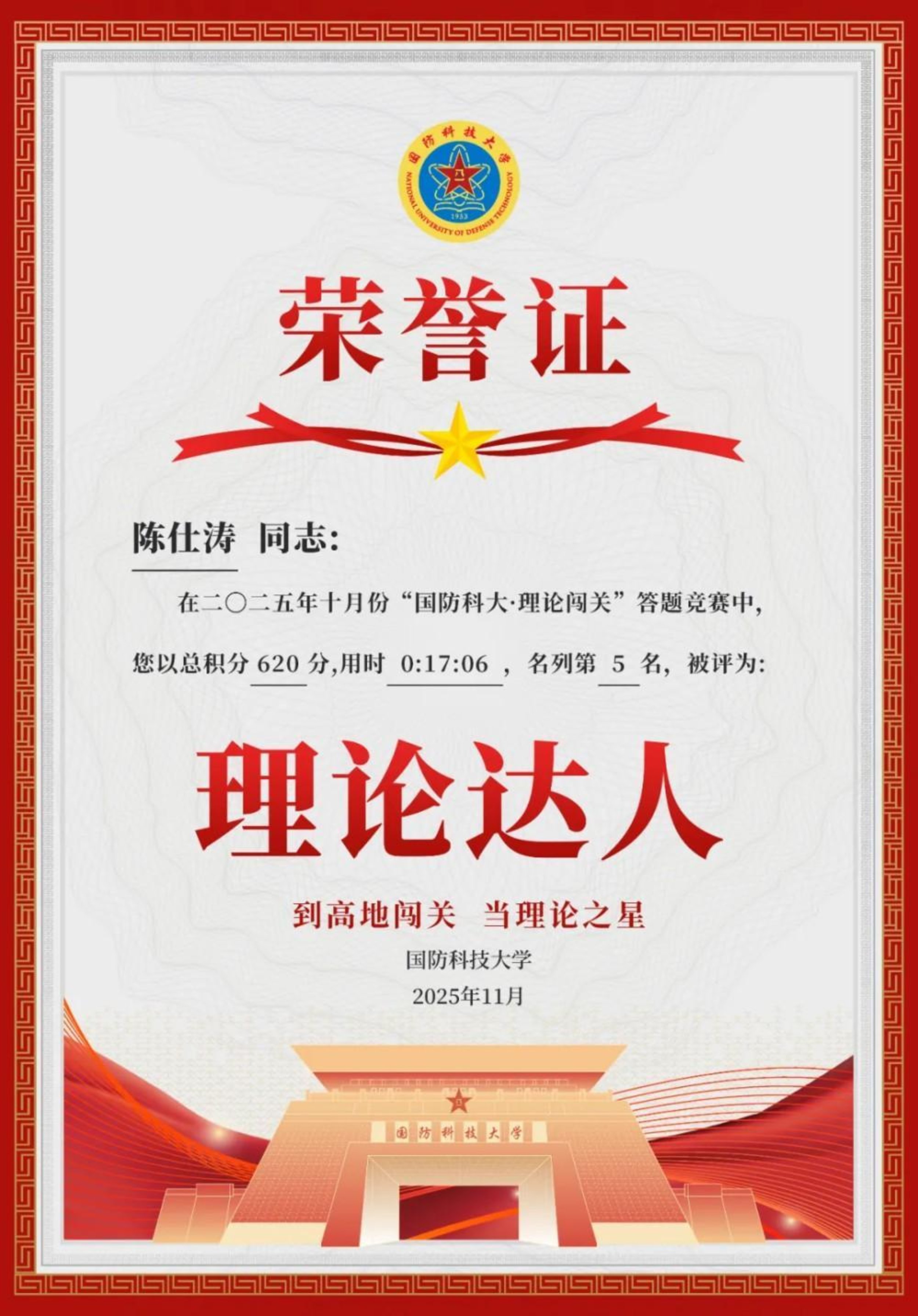 获奖感言:每一秒闯关,都是穿越思想迷雾,锚定真理坐标的旅程;每一次闯关,都如科研攻关时滴水不漏的严谨;每一天闯关,都是纯粹思维的洗礼,也是指导实践的钥匙;每一月闯关后荣获理论达人,既是照亮一月努力的勋章,也是吹响战场打赢的号角。理论闯关胜利者,誓作科研至尖兵,必做战场打赢人。