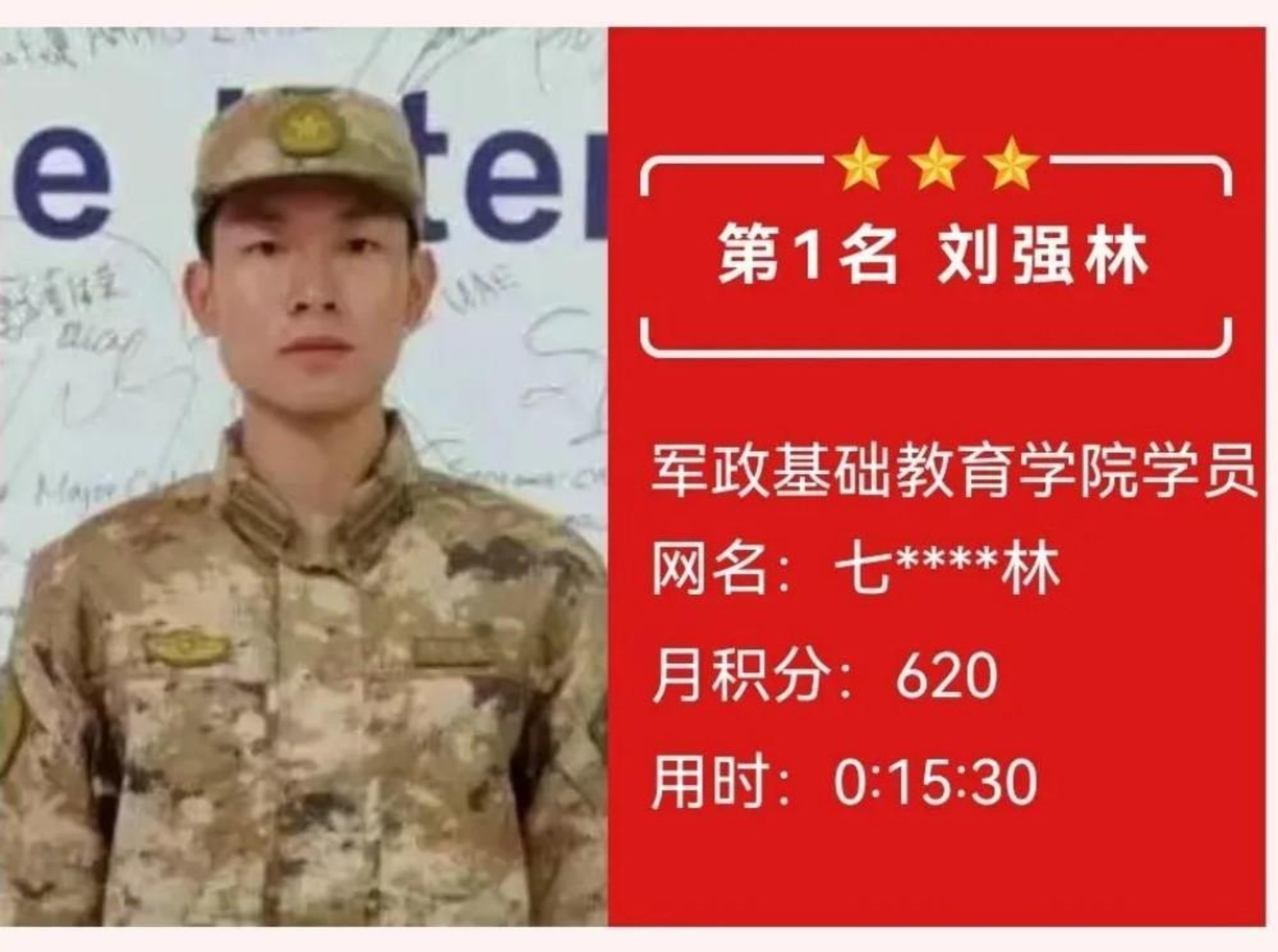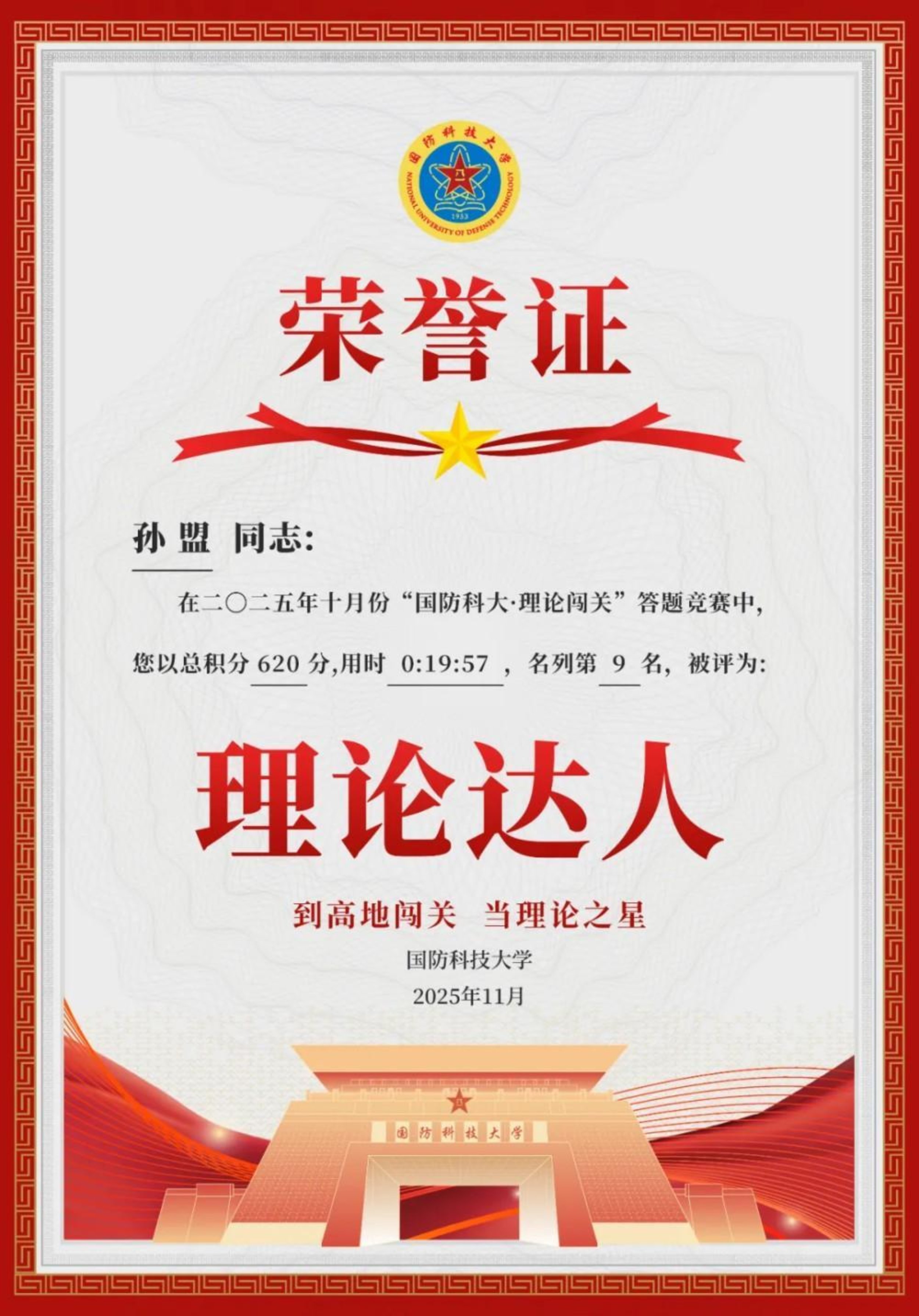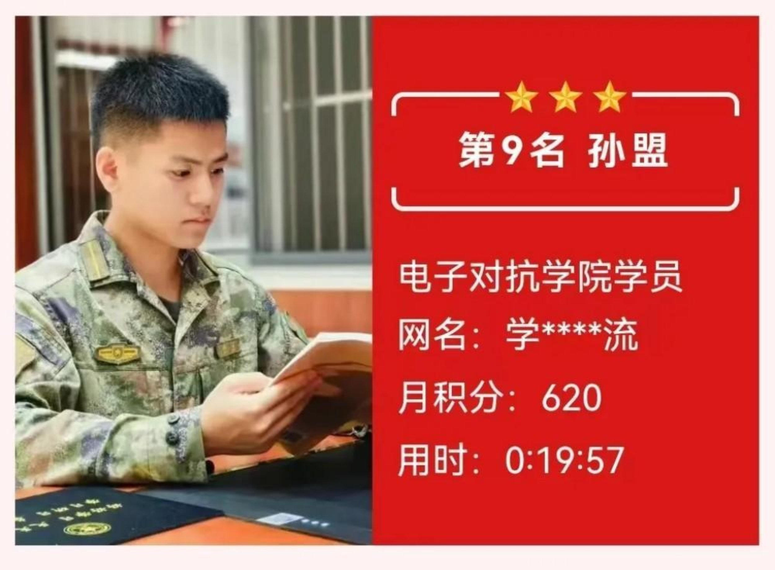 获奖感言:学道须当猛烈,始终确守初心。在理论答题的层层闯关中,我深切体会到知识如何沉淀为内心的力量。每月的积累不仅是智慧的叠加,更是意志的锤炼。那些与知识相伴的深夜,那些反复推敲的瞬间,都在默默锻造着军校学员应有的沉稳与坚韧,这份荣誉属于每个共同奋斗的日夜。未来我将继续厚积薄发,让理论之光照亮前行之路,在强军征程中锤炼使命担当。