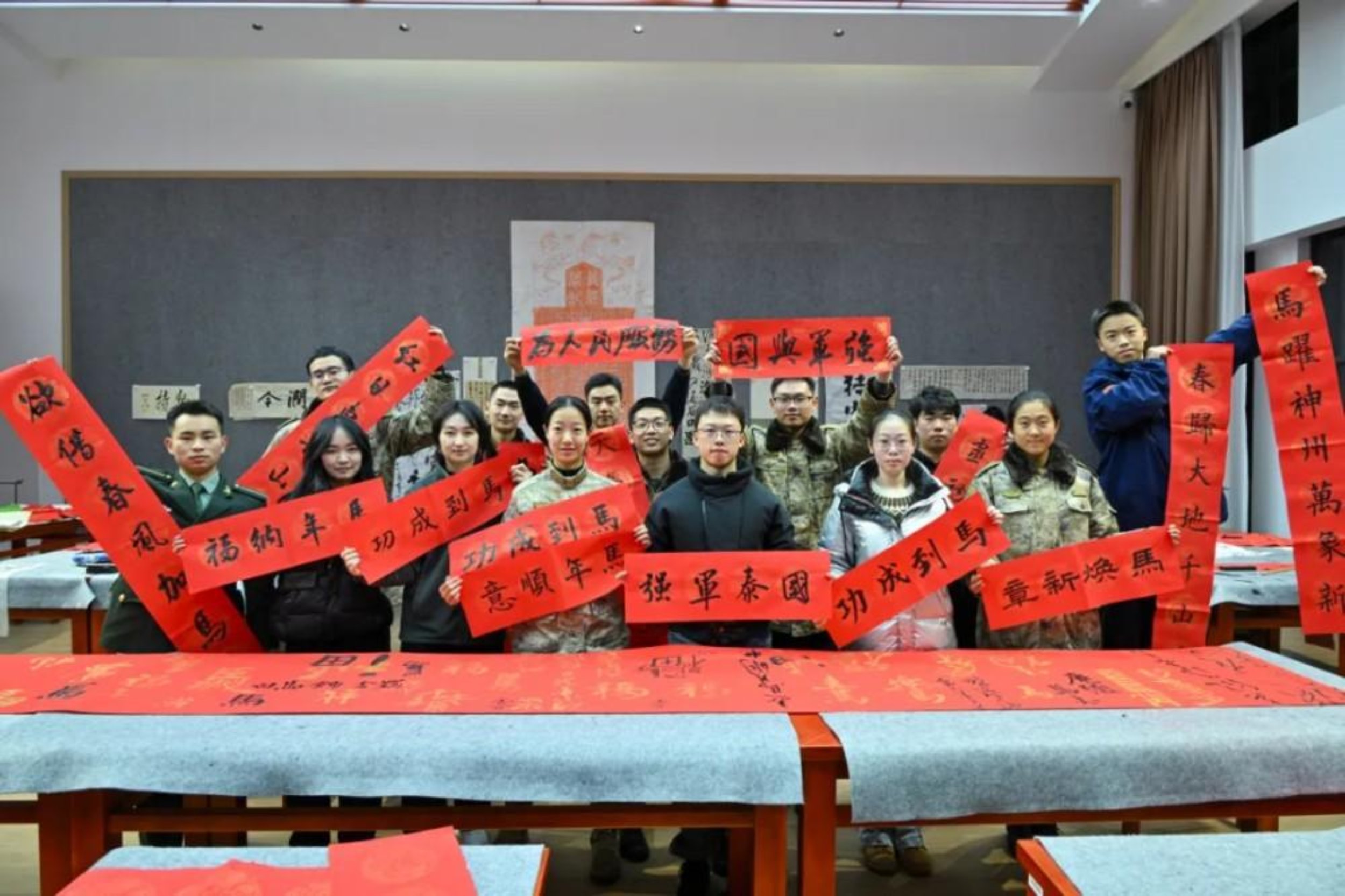 “笔剑雄风”书法篆刻俱乐部组织了元旦写联活动。红绸长卷上,各式“马”字、“福”字跃然纸上,大家以笔寄情,将新年的期许凝于笔尖,戎装执笔书马岁,墨香砺剑贺新年!