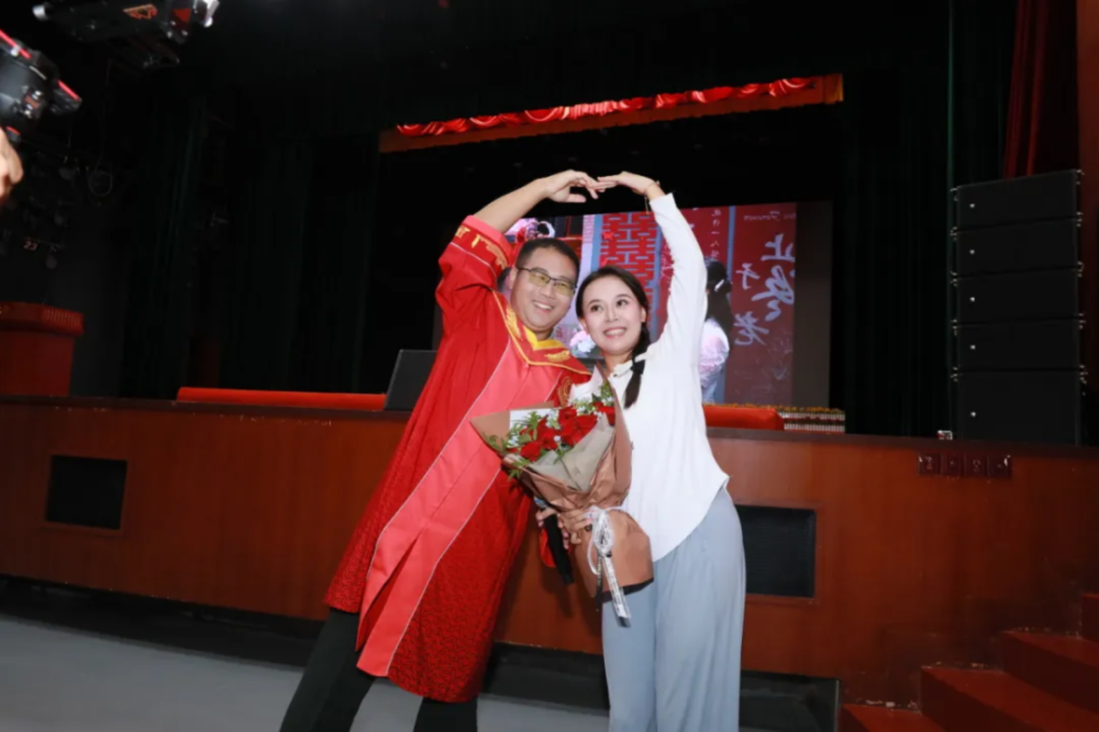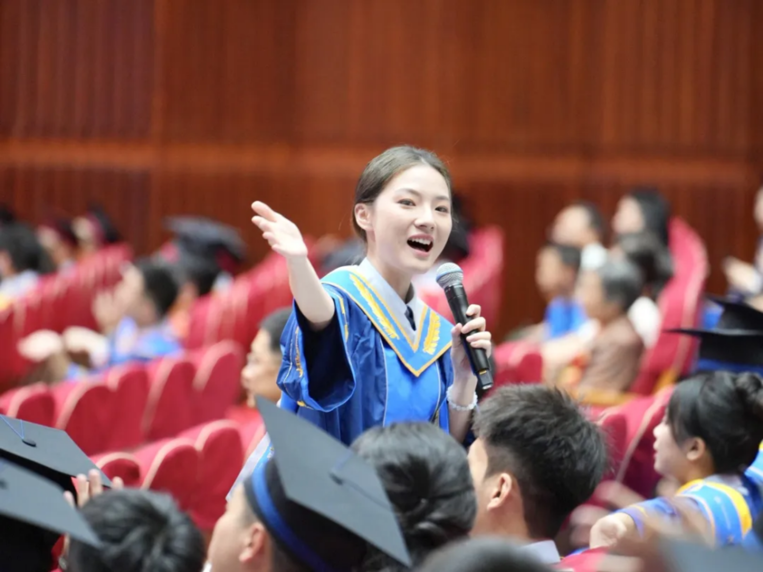 仪式开始前,精彩的暖场表演为现场营造了热烈而温馨的氛围。参与暖场表演的博士学位获得者于航的妻子易琳难掩激动:“作为国防科大2025届毕业生的家属,我此刻仍沉浸在学位授予仪式温暖、热烈的氛围中。当我站在暖场演出的舞台上,看着台下身着戎装的学子们,突然理解了爱人这些年的坚守与追求。特别感动的是,可以在这样的场合中获得大家对我们的祝福,也让我们倍感幸运。最后,衷心祝愿国防科大这所承载着热血与信仰的学府,能够以燎原之势为祖国培育更多脊梁,愿学校再谱华章!”