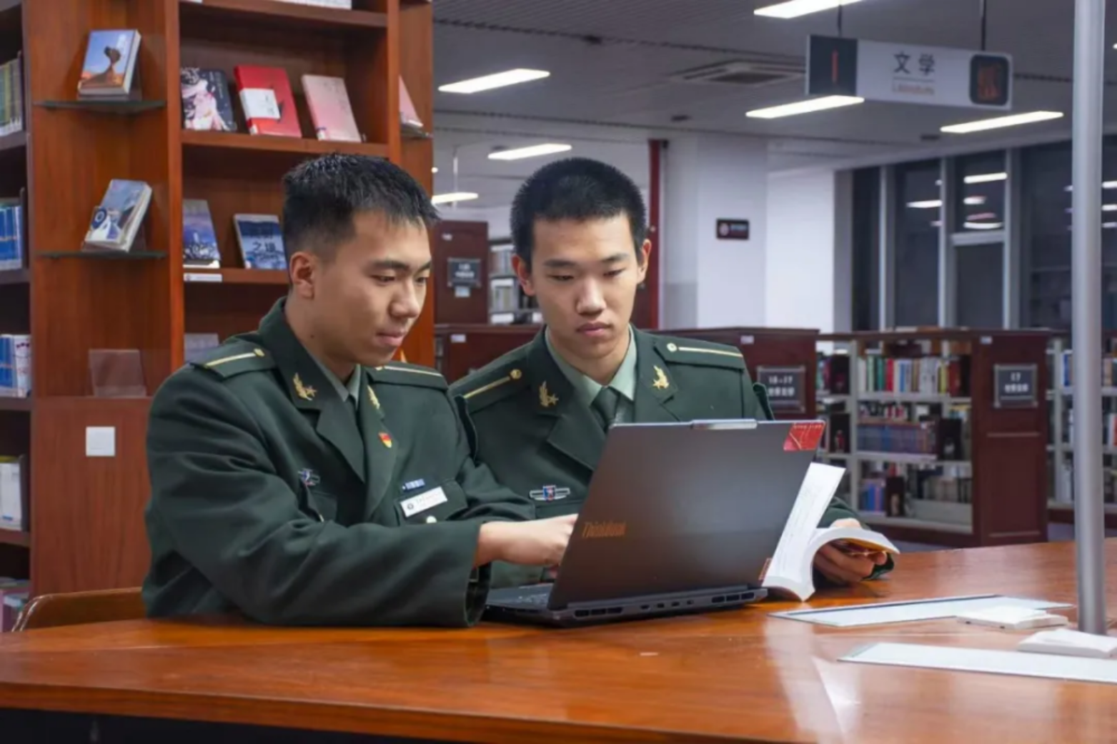 学校图书馆内,军装笔挺