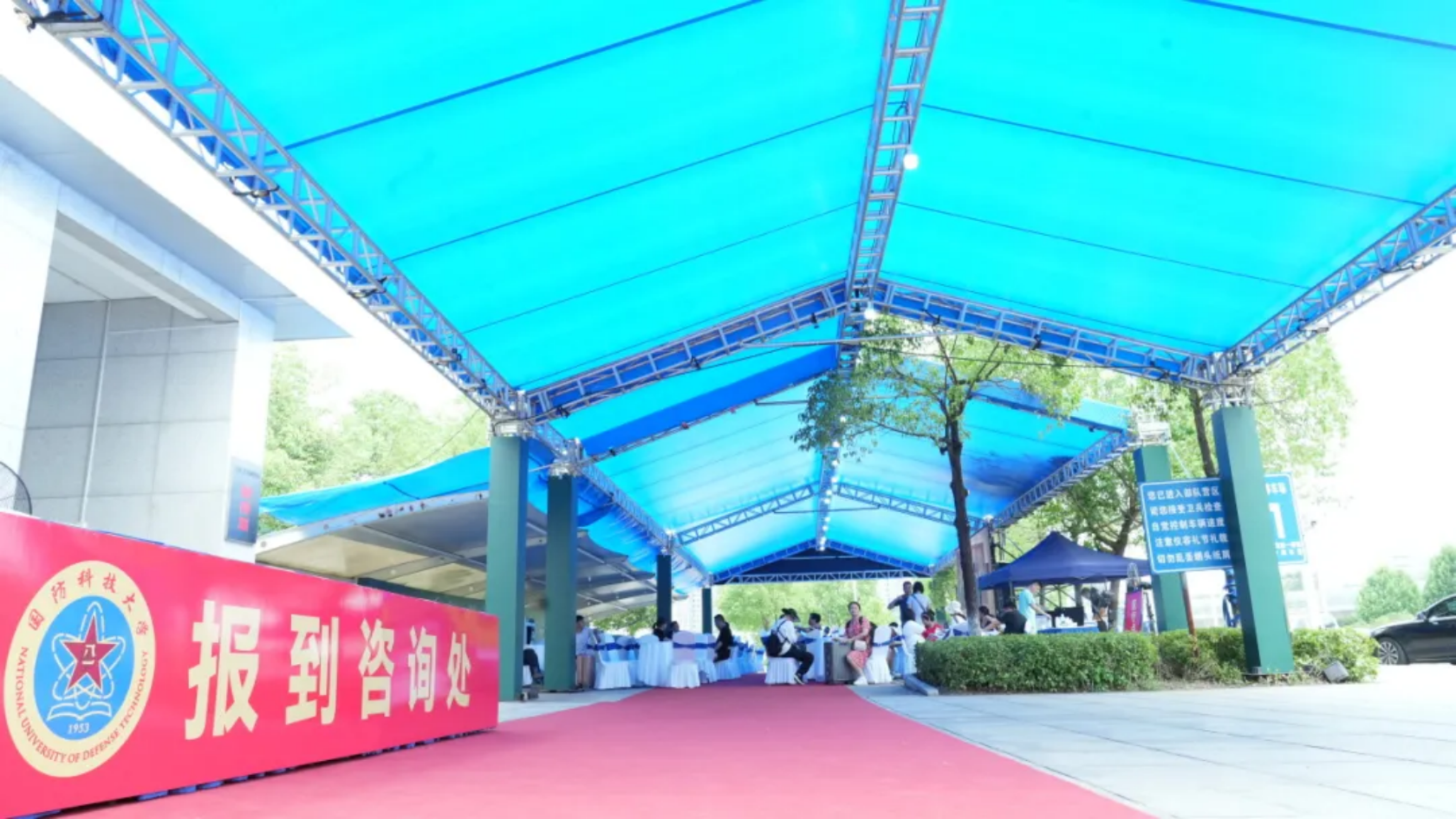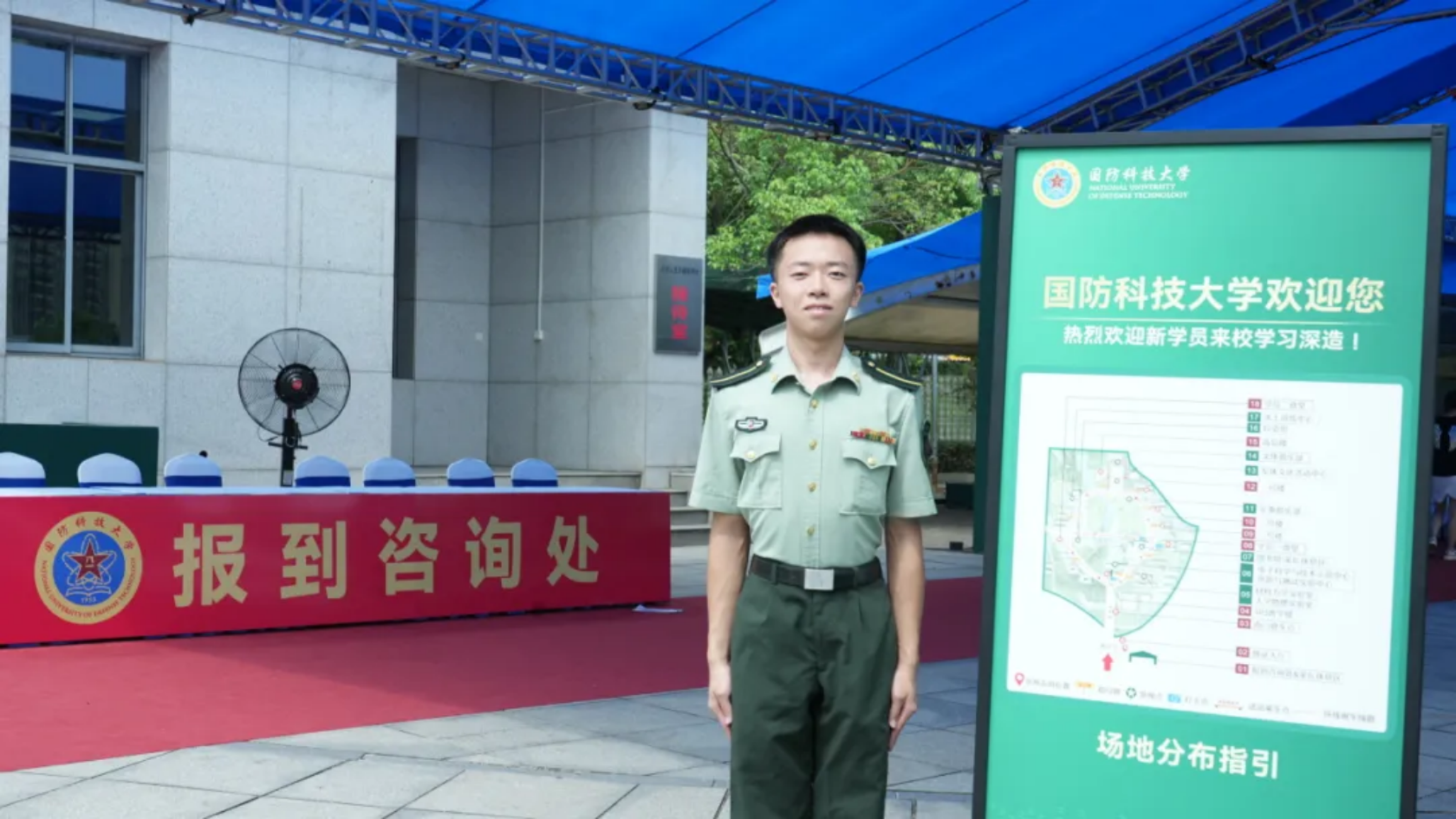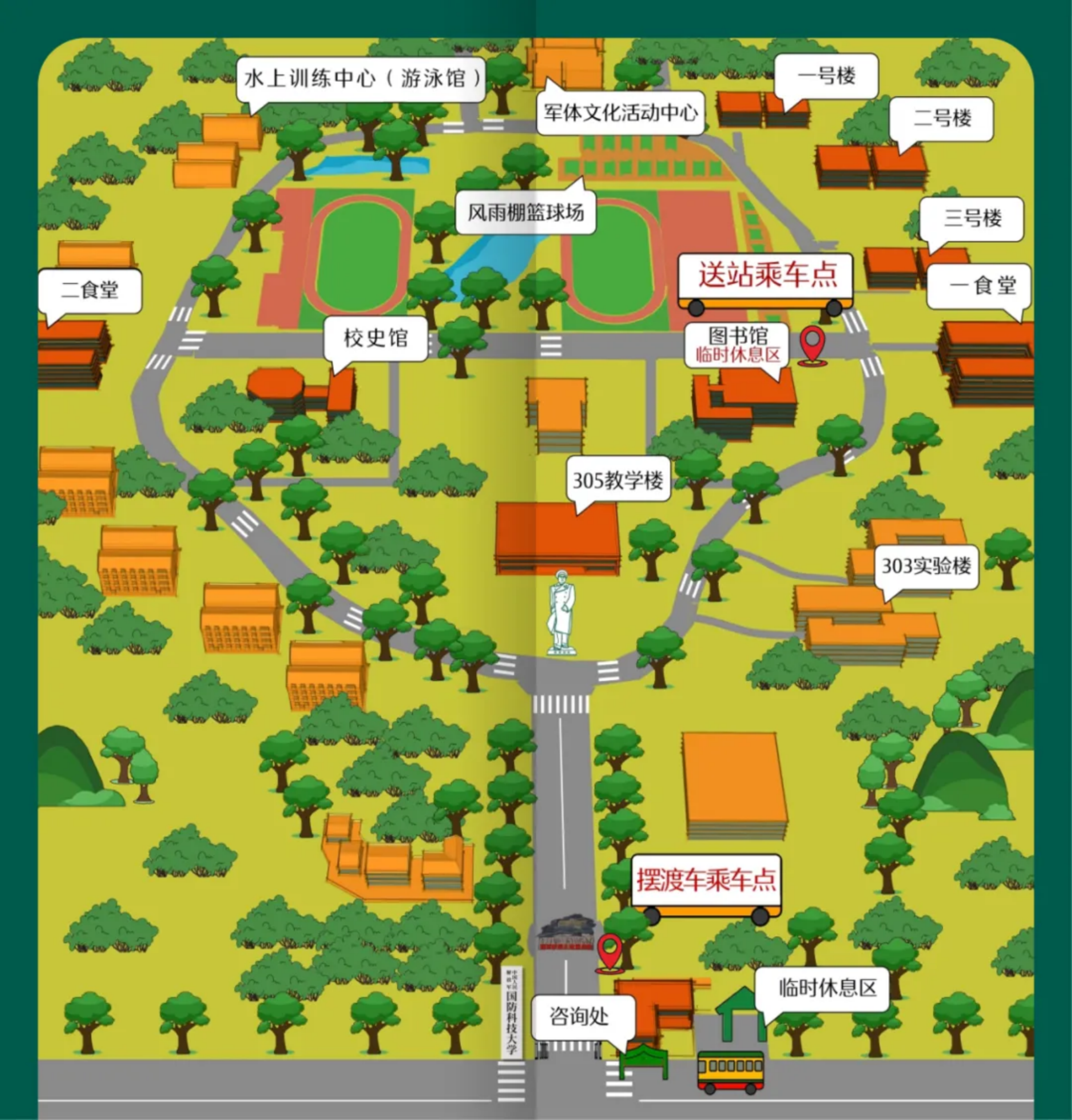 推荐线路:南门迎新点——实验室与教学示范中心——校史馆(临时休息区)——图书馆(临时休息区)——军体文化活动中心——风雨棚篮球场——各学员队迎新点——新学员家长就餐区