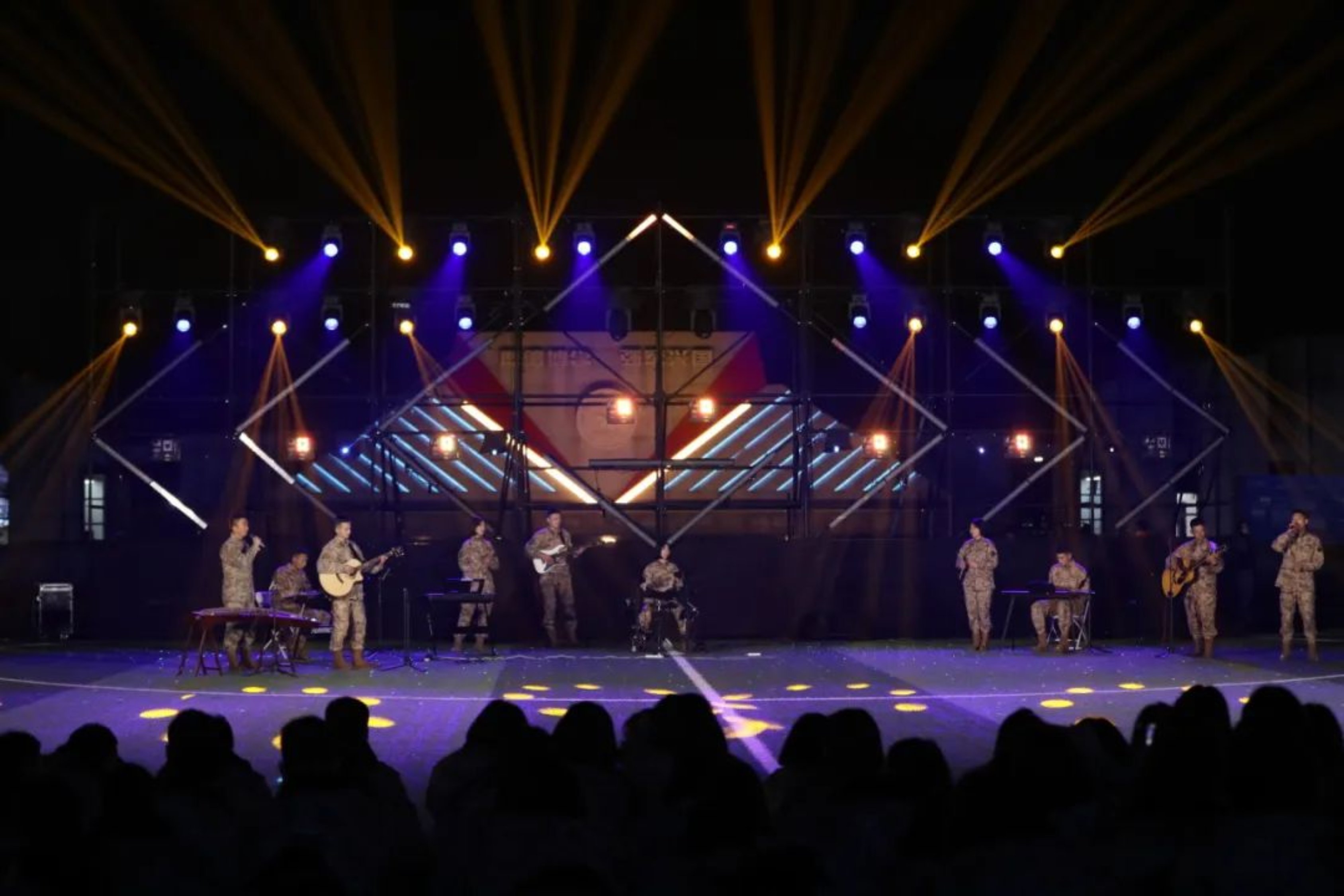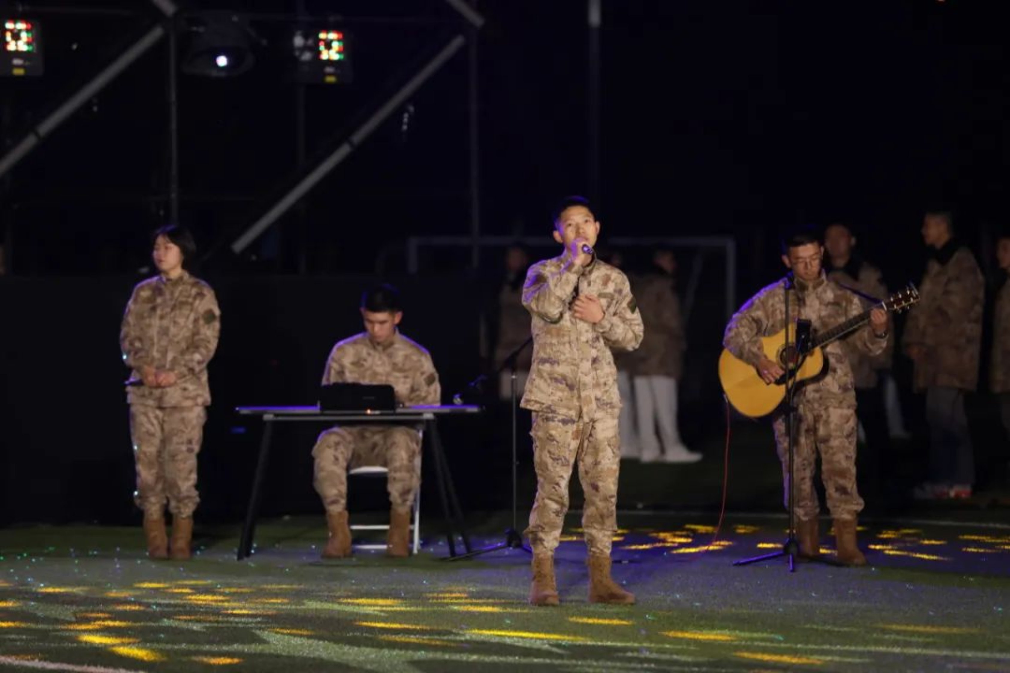 夜幕中,灯光点点,“信胜之韵”文艺汇演让操场成了一片青春的海洋,驻地艺术乐团和学院基层俱乐部官兵在操场上载歌载舞。