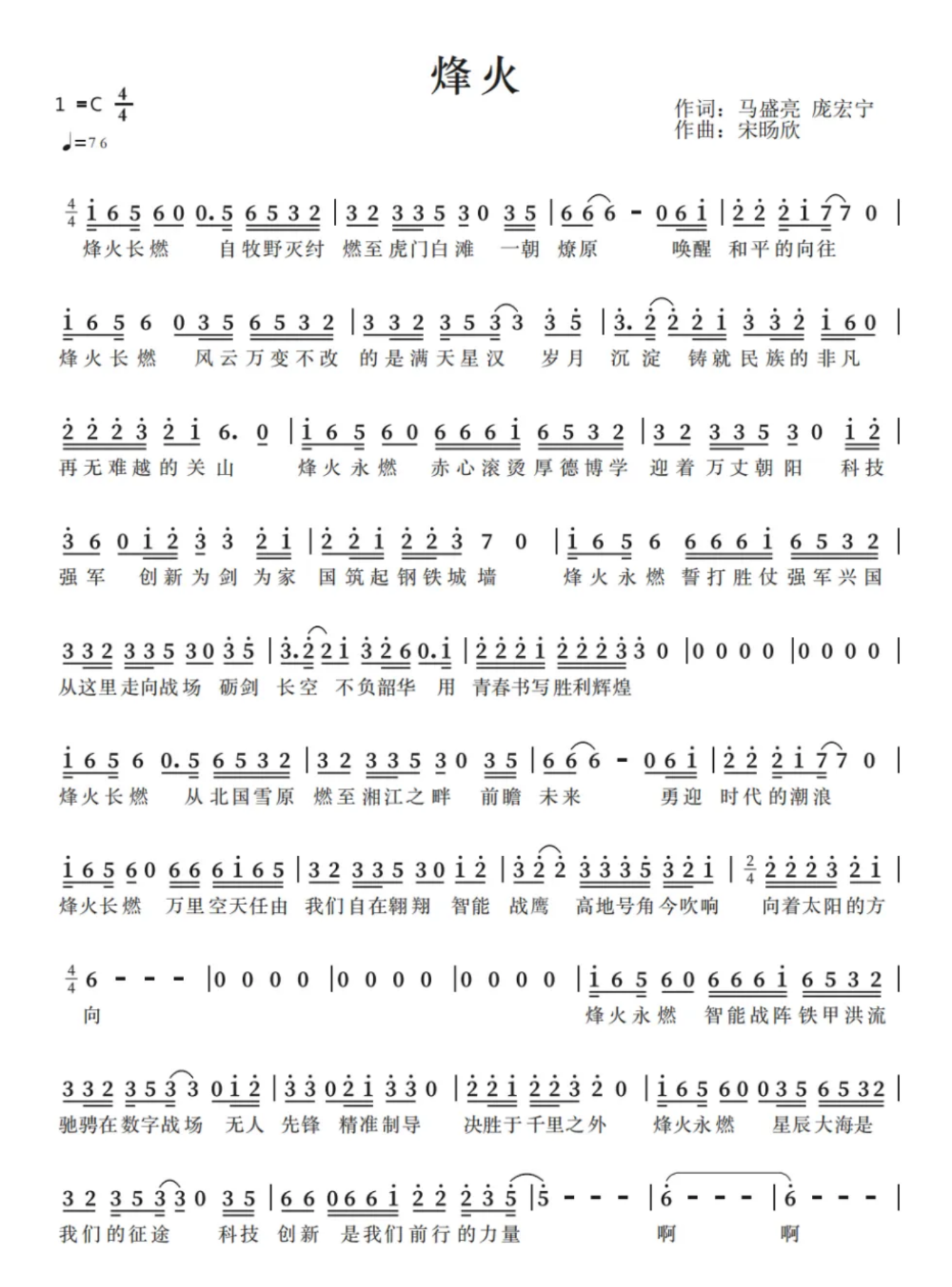 《烽火》承载着民族的历史记忆,更点燃新时代强军担当。它咏叹历史荣光,承载训词精神,澎湃青春热血,激励全体科大人——以赤心滚烫厚德博学,以胜仗信念强军兴国,不负韶华,向着太阳的方向,为和平、为胜利、为辉煌,让烽火永燃不息!