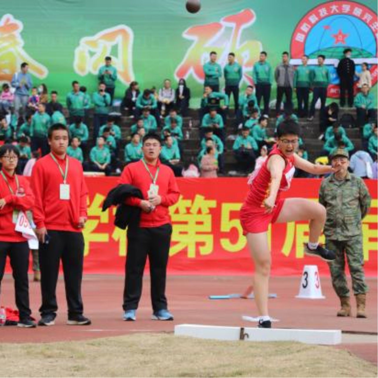 手托铅球,续凯旋深吸一口气。腰部的持续疼痛使他无法高强度用力,但他仍咬牙坚持,伸展手臂,挥出一个漂亮的圆。去年夺冠后,续凯旋保持定力,始终坚持在铅球训练场上,从未懈怠。天有不测,比赛前因运动量过大,他腰部扭伤,几近诀别赛场。干部、同学纷纷劝他“明年再战”,他总是斩钉截铁:“比赛一定要去,小伤而已!”今年虽与金牌擦肩而过,但续凯旋已经成为我们心中的“无冕之王”。![]()