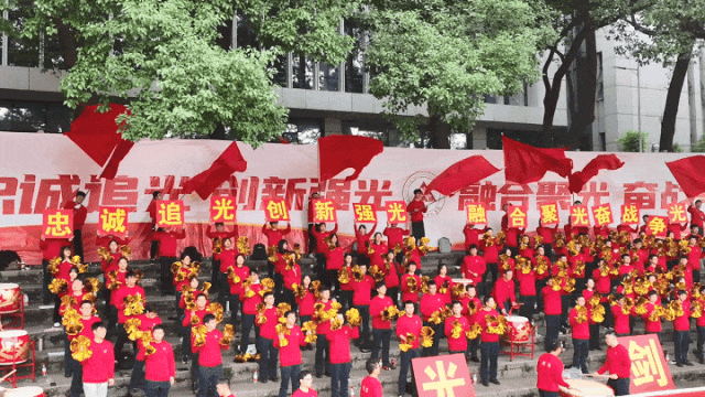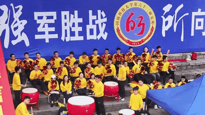 呐喊声如雷阵阵,击鼓声不绝于耳。红扇翩跹,举牌高扬,他们将必胜决心向世界昭告。热血活泼、青春洋溢,他们誓要书写辉煌!