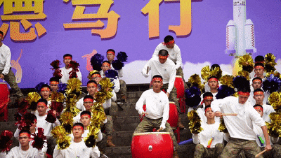 鼓声震如雷,喊声扬精神。一袭白衣立于火箭模型之侧,红黄蓝花球时时舞动。以一敌百,是他们勇往直前的胜利!