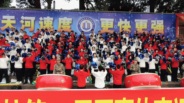 传承银河精神,建设天河文化。蓝白花球翻腾,激昂的鼓声点燃如火热情;黄绿彩棒挥舞,有力的喊声鼓舞人心。整齐划一、活力迸发。